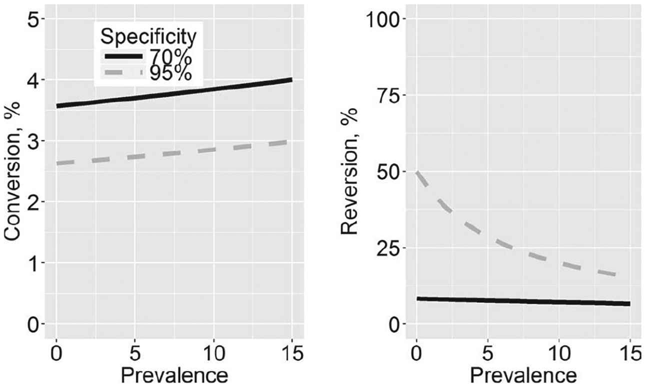 Test-retest variability had a large effect on the observed proportion of conversions (initial negative test, followed by a positive test) and reversions (initial positive test, followed by a negative test). For example, a test with 70% specificity and 5% test-retest variability would be associated with a conversion rate of 3.7% and a reversion rate of 7.7%, while a test with 95% specificity but 10% test-retest variability would be associated with a conversion rate of 5.5% and a reversion rate of 57%, assuming that both tests are 80% sensitive and underlying LTBI prevalence was 5%.