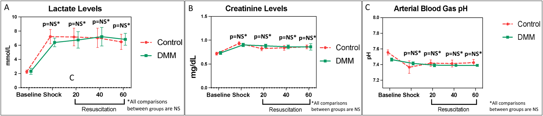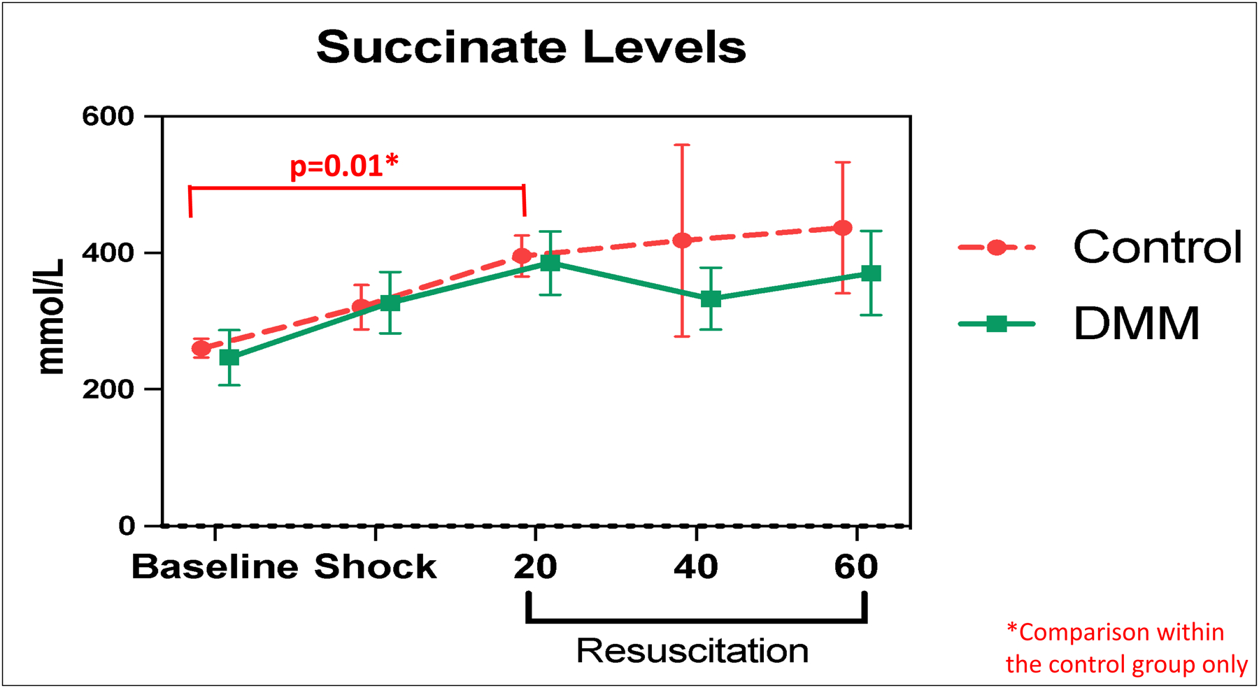 The carotid arteries of Yorkshire pigs were cannulated with a 5-French catheter. After placement of a Swan-Ganz catheter and femoral arterial line, the carotid catheters were opened and the animals were exsanguinated to a mean arterial pressure (MAP) of 45 mm. After 30 minutes in the shock state, the animals were resuscitated to a MAP of 60 mm using lactated ringers. A MAP above 60 mm was maintained throughout RES. One group received 10 mg/kg of DMM (n=6) while the control received sham injections (n=6). The primary end-point was SI levels. Secondary end-points included cardiac function and lactate.