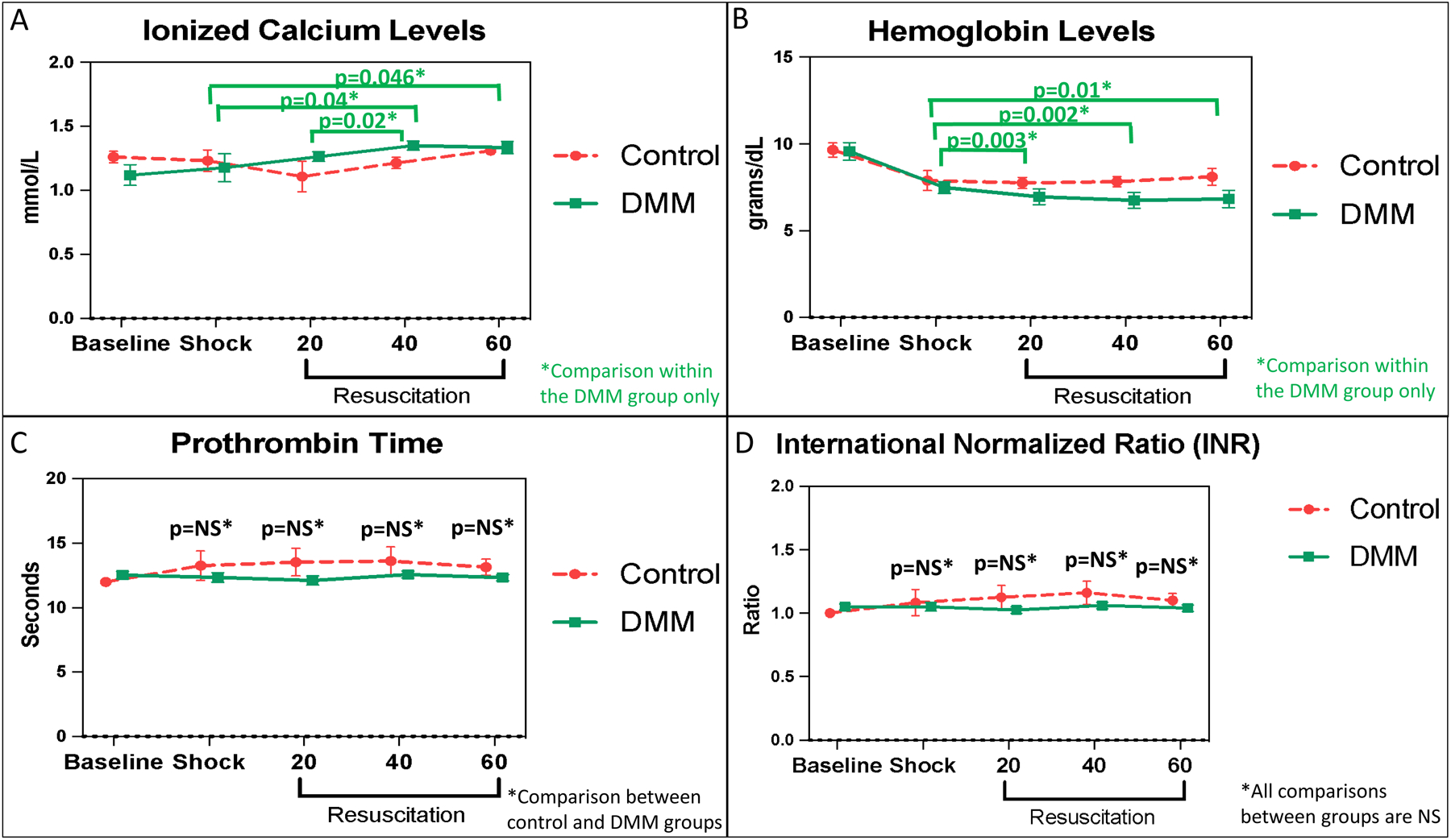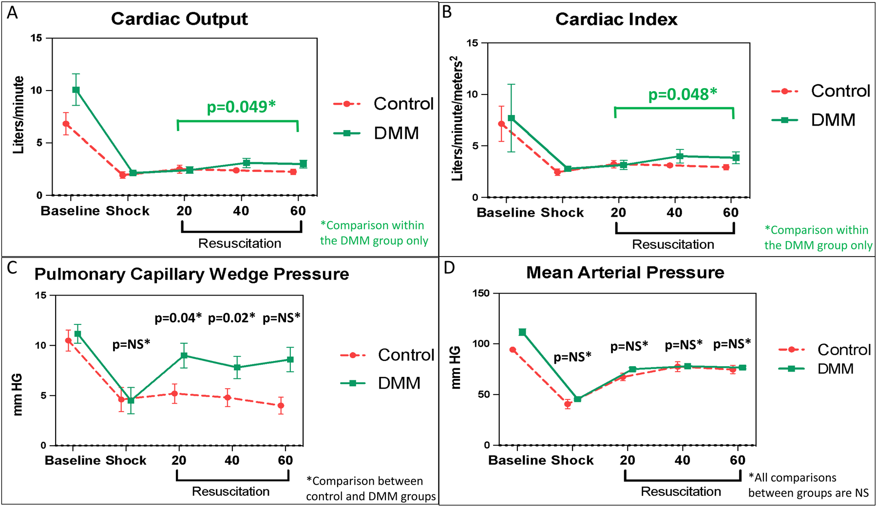 SI levels increased from baseline to the 20-minute RES point in control, while the DMM cohort remained unchanged. The DMM group required less IV fluid to maintain a MAP above 60 (450.0 vs. 229.0 mL, p=0.01). The DMM group had higher pulmonary capillary wedge pressure at the 20 and 40-minute RES points. The DMM group had better recovery of cardiac output and index during RES, while the control had no improvement. While lactate levels were similar, DMM may lead to increased ionized calcium levels.