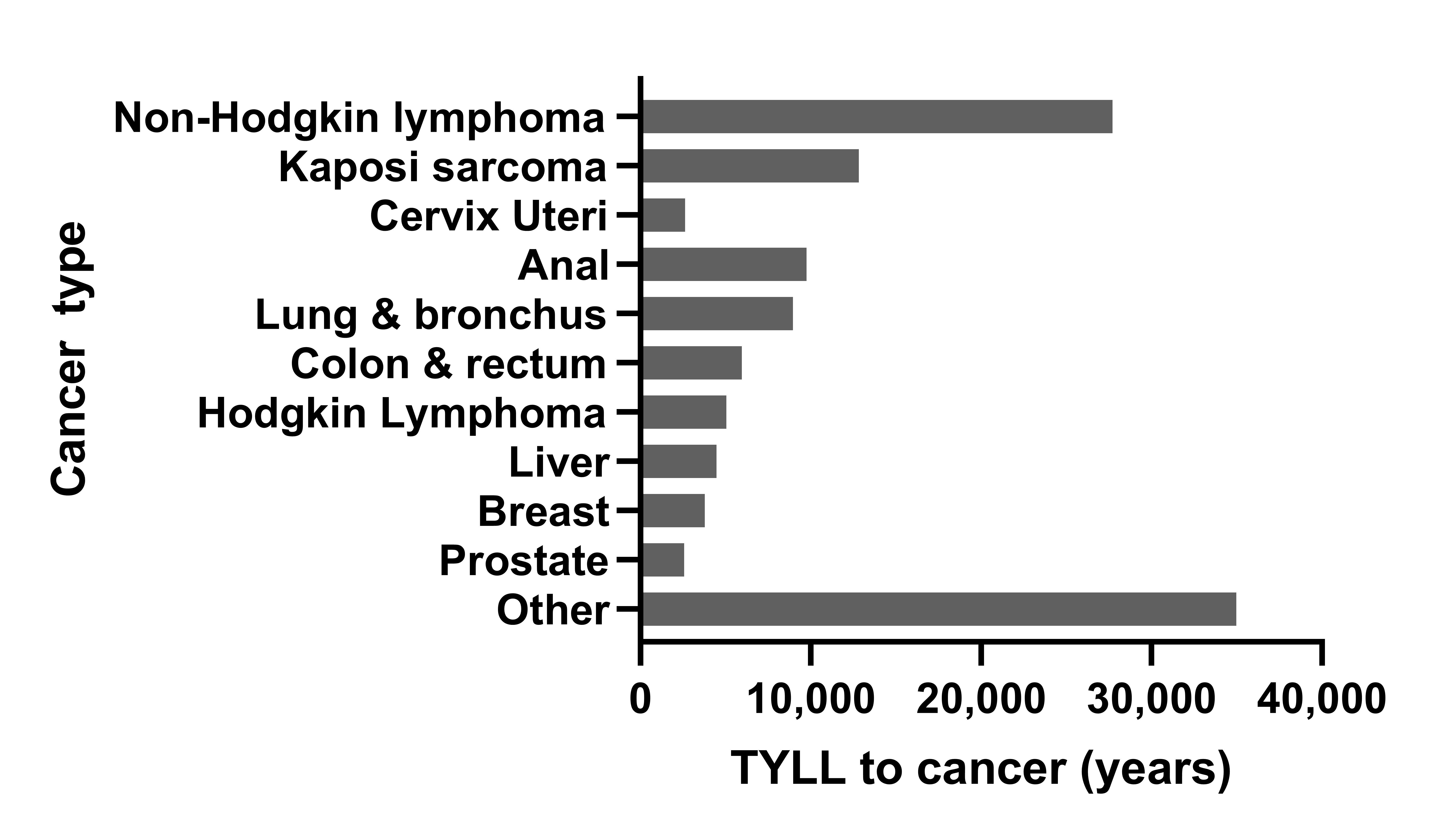 Among 466,234 PLWH in the study population, 25,772 (5.5%) developed cancer during 2006–2015. Nationally, an estimated 134,986 years of life were lost to cancer of all types during 2006–2015 among PLWH, representing 9.6% of TYLL to all causes. Non-Hodgkin lymphoma (NHL), Kaposi sarcoma (KS), anal cancer, and lung cancer were the four largest cancer contributors (45% of TYLL to cancer). The largest fraction of TYLL occurred among Black PLWH, men who have sex with men, and PLWH aged 40–59 years old.