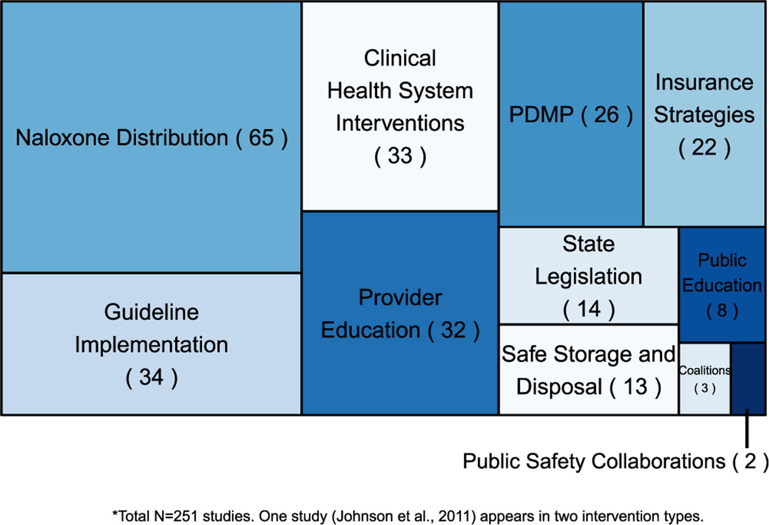 We conducted a systematic review of publications reporting on rigorous evaluations of systems-level interventions to address provider and patient/public behavior and prevent prescription and illicit opioid overdose. A total of 251 studies were reviewed. Interventions studied included 1) state legislation and regulation, 2) prescription drug monitoring programs (PDMPs), 3) insurance strategies, 4) clinical guideline implementation, 5) provider education, 6) health system interventions, 7) naloxone education and distribution, 8) safe storage and disposal, 9) public education, 10) community coalitions, and 11) interventions employing public safety and public health collaborations.