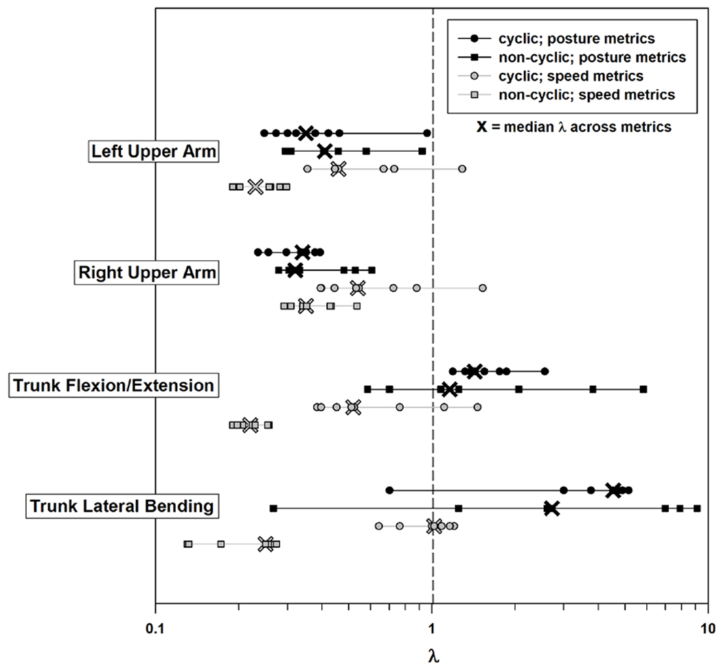 Description:Musculoskeletal disorders (MSDs) are common among manufacturing workers. Exposure to non-neutral postures and high movement speeds associated with MSDs among manufacturing workers may depend on the extent of the variability in the work tasks performed (i.e., predominantly "cyclic" versus "non-cyclic" work). The objectives of this study were to (i) compare mean levels of full-shift exposure summary metrics based on both posture and movement speed between manufacturing workers performing predominantly cyclic (n = 18) and non-cyclic (n = 17) tasks, and (ii) explore patterns of between- and within-worker exposure variance and between-minute (within-shift) exposure level and variation within each group. Inertial sensors were used to measure exposures for up to 15 full shifts per participant. Results indicated (i) substantially higher upper arm and trunk movement speeds among workers performing predominantly cyclic tasks relative to workers performing non-cyclic tasks despite similar postures, and (ii) greater exposure variability both between and within workers in the non-cyclic group.