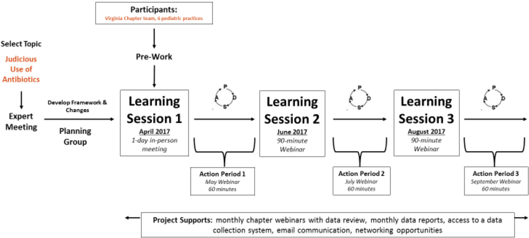 Description:An American Academy of Pediatrics State Chapter organized a 6-month, mostly online quality improvement learning collaborative to improve antibiotic prescribing and patient education for upper respiratory infection (URI) and acute otitis media (AOM). Practices submitted data on quality measures at baseline, monthly, and 4 months post-project. Fifty-three clinicians from 6 independent, private primary care pediatric practices participated. Use of first-line antibiotics for AOM increased from 63.5% at baseline to 80.4% 4 months post-project. Use of safety-net antibiotic prescriptions (SNAP) for AOM increased from 4.5% to 16.9%. Educating patients about management for URI increased from 66.1% to 88.0% and for AOM from 20.4% to 85.6%. Practices maintained high performance for not prescribing antibiotics for URI (94.4% to 96.2%). Leveraging local relationships and national resources, this replicable antibiotic stewardship project engaged independent private practices to improve patient education for URI and AOM and prescribing and use of SNAP for AOM.