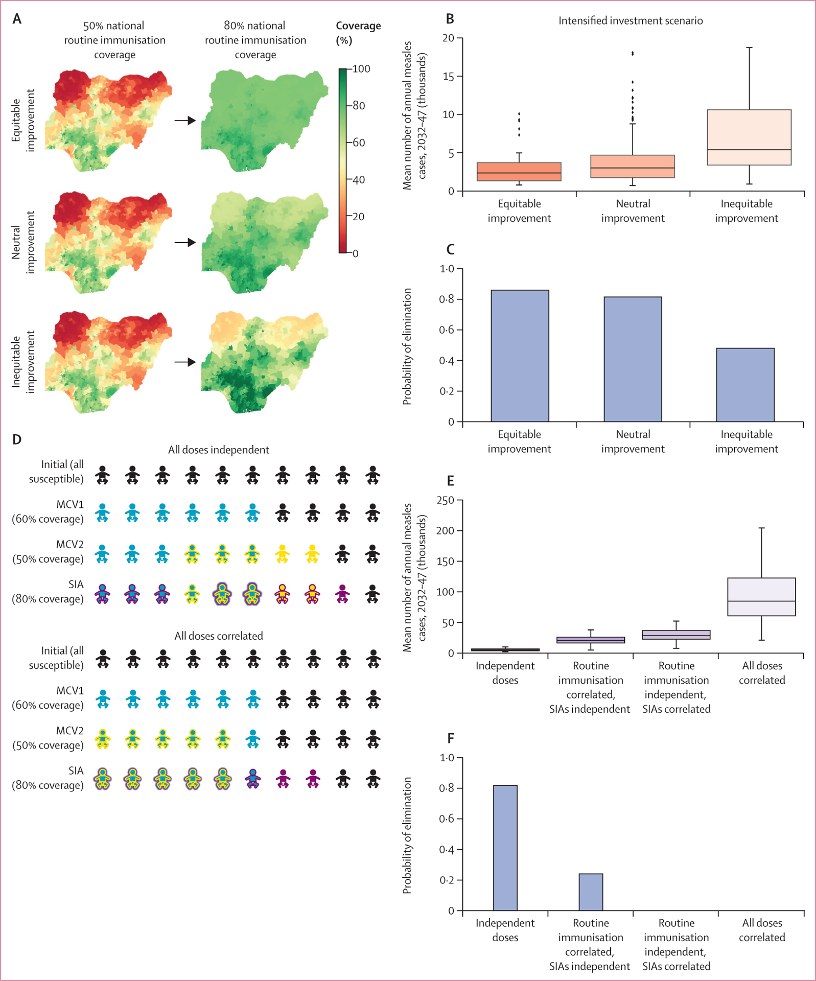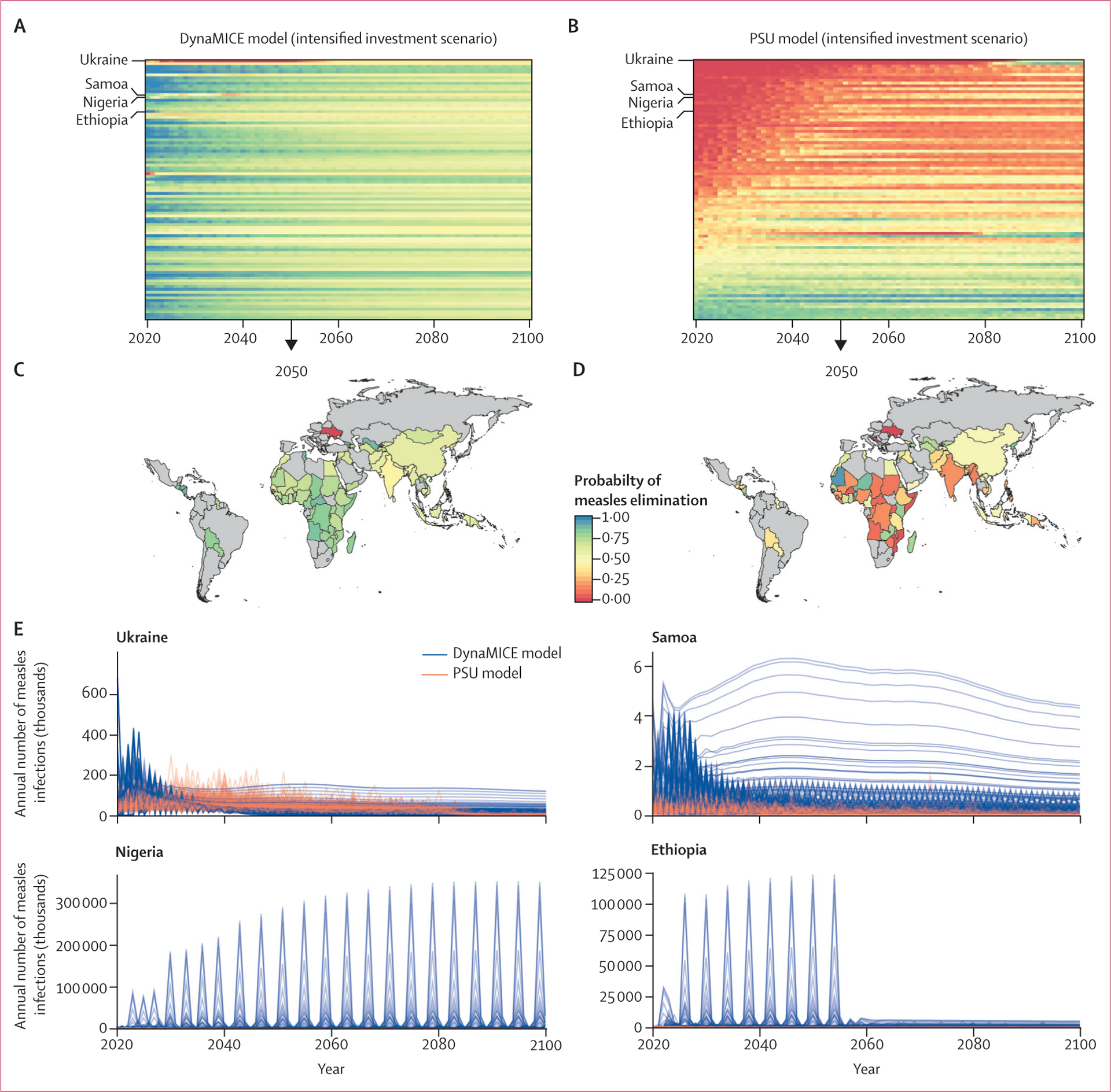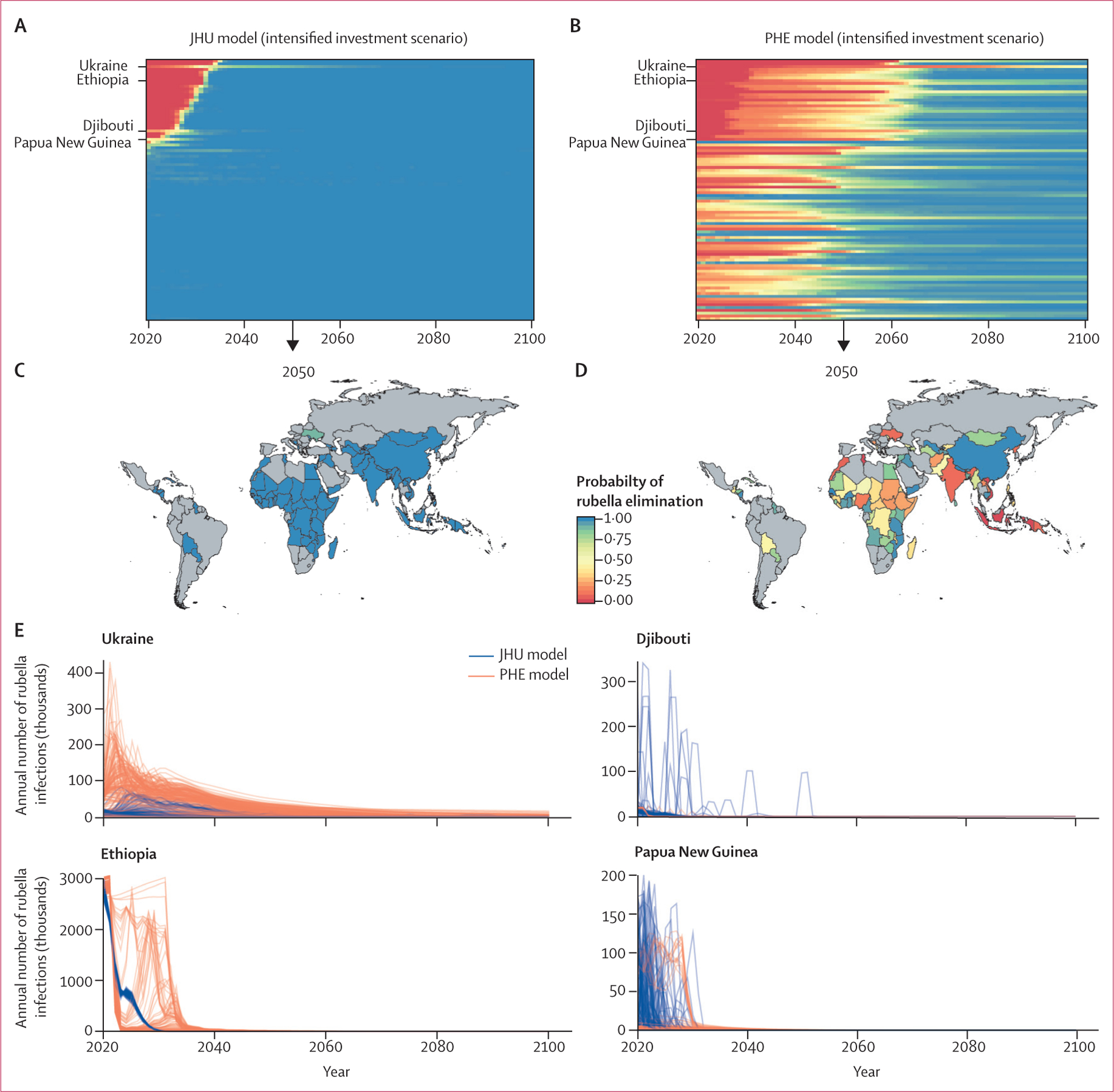 The intensified investment scenario led to large reductions in measles and rubella incidence and burden. Rubella elimination is likely to be achievable in all countries and measles elimination is likely in some countries, but not all. The PSU and DynaMICE national measles models estimated that by 2050, the probability of elimination would exceed 75% in 14 (16%) and 36 (39%) of 93 modelled countries, respectively. The subnational model of measles transmission highlighted inequity in routine coverage as a likely driver of the continuance of endemic measles transmission in a subset of countries.