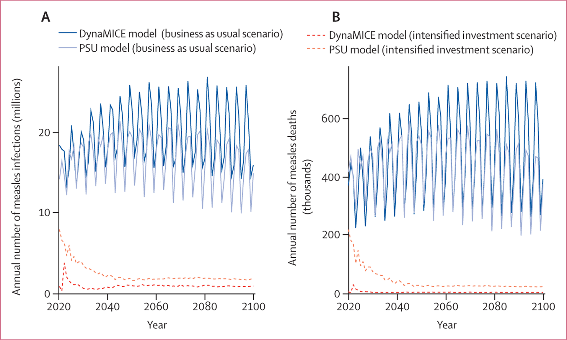 Marked reductions in the incidence of measles and rubella have been observed since the widespread use of the measles and rubella vaccines. Although no global goal for measles eradication has been established, all six WHO regions have set measles elimination targets. However, a gap remains between current control levels and elimination targets, as shown by large measles outbreaks between 2017 and 2019. We aimed to model the potential for measles and rubella elimination globally to inform a WHO report to the 73rd World Health Assembly on the feasibility of measles and rubella eradication.