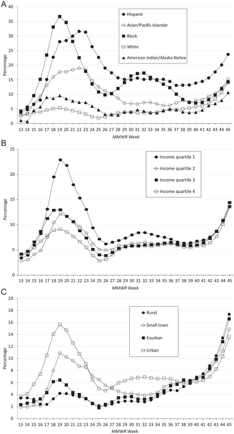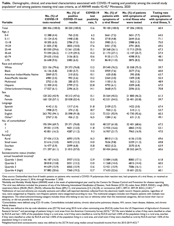 Cumulative COVID-19 positivity rates were similar for people aged 12-64 years (range, 15.1%-17.6%) but lower for adults aged ≥65 years (range, 9.3%-10.7%). We found notable racial and ethnic disparities in positivity rates early in the pandemic, whereas COVID-19 positivity was similarly elevated across most racial and ethnic groups by the end of 2020. Positivity rates remained substantially higher among Hispanic patients compared with other racial and ethnic groups throughout the study period. We found similar trends across area-level income and rurality, with disparities early in the pandemic converging over time.