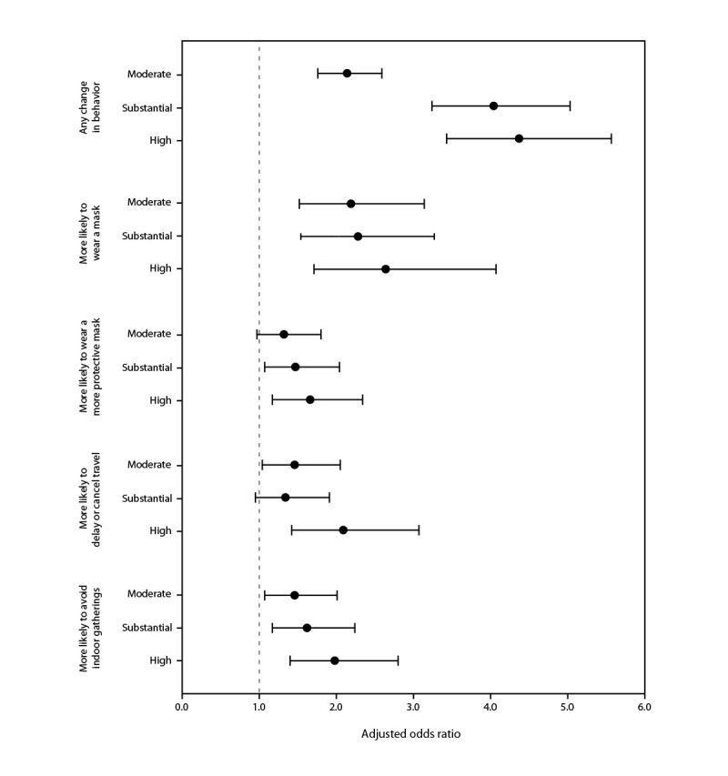 Description:During the early stages of the COVID-19 pandemic, use of preventive behaviors was associated with perceived risk for contracting SARS-CoV-2 infection (1,2). Over time, perceived risk has declined along with waning COVID-19-related media coverage (3,4). The extent to which communities continue to be aware of local COVID-19 transmission levels and are implementing recommended preventive behaviors is unknown. During June 1-July 31, 2022, health departments in DuPage County, Illinois and metropolitan Detroit, Michigan surveyed a combined total of 4,934 adults who had received a positive test result for SARS-CoV-2 during the preceding 3 weeks. The association between awareness of local COVID-19 transmission and use of preventive behaviors and practices was assessed, both in response to perceived local COVID-19 transmission levels and specifically during the 2 weeks preceding SARS-CoV-2 testing. Both areas had experienced sustained high COVID-19 transmission during the study interval as categorized by CDC COVID-19 transmission levels.* Overall, 702 (14%) respondents perceived local COVID-19 transmission levels as high, 987 (20%) as substantial, 1,902 (39%) as moderate, and 581 (12%) as low; 789 (16%) reported they did not know. Adjusting for geographic area, age, gender identity, and combined race and ethnicity, respondents who perceived local COVID-19 transmission levels as high were more likely to report having made behavioral changes because of the level of COVID-19 transmission in their area, including wearing a mask in public, limiting travel, and avoiding crowded places or events. Continued monitoring of public perceptions of local COVID-19 levels and developing a better understanding of their influence on the use of preventive behaviors can guide COVID-19 communication strategies and policy making during and beyond the pandemic.