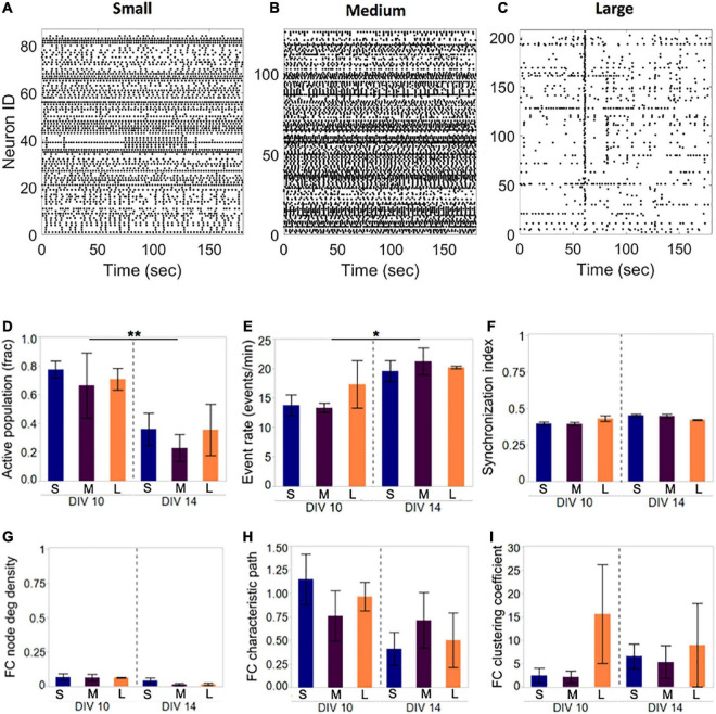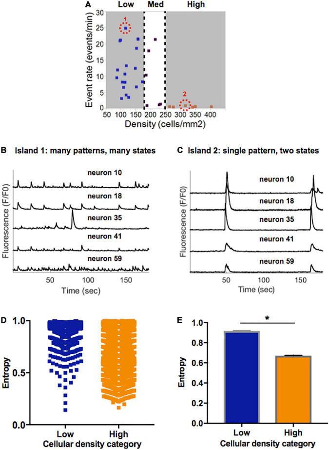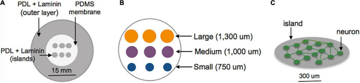 Primary cortical neurons were plated on a substrate patterned to promote attachment in clusters of hundreds of cells (islands), transduced with GCaMP6f, allowed to mature until 10–13 days in vitro (DIV), and monitored with Ca2+ as a non-invasive proxy for electrical activity. We adjusted two structural factors–island size and cellular density–to evaluate their role in guiding spontaneous activity and network formation in neuronal islands.