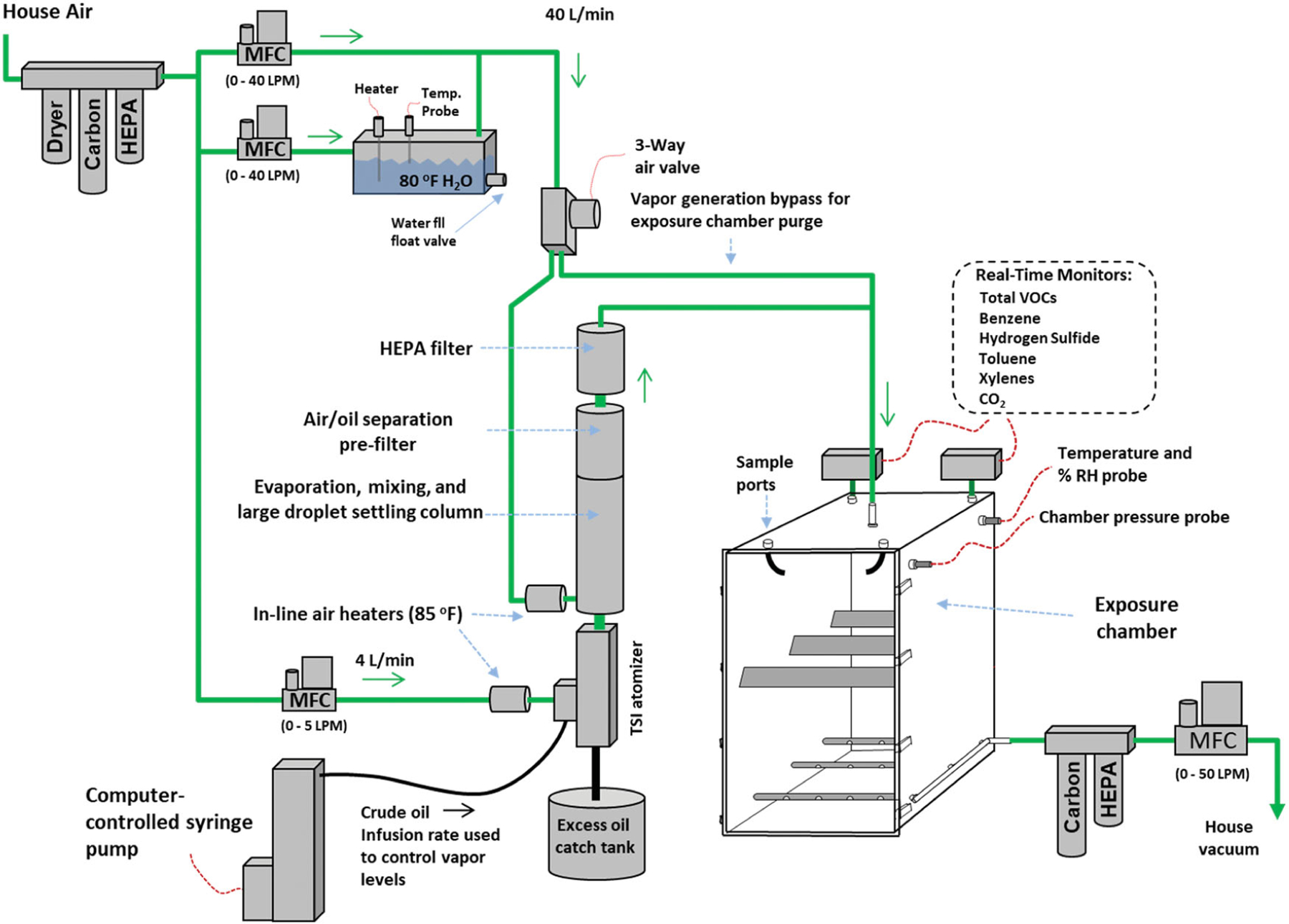 Vapor from heated Deepwater Horizon surrogate oil was atomized into a fine mist then diluted with filtered air, then the air/droplet mixture was routed into an evaporation column with an high efficiency particulate air (HEPA) filter on its exit port. The HEPA filter was used to remove oil particles, thus ensuring only vapor would pass. The vapor was then introduced into a custom-built exposure chamber housing rats. A calibrated flame ionization detector was used to read the total volatile organic compounds (TVOC) in real time, and custom software was developed to automatically adjust the amount of oil entering the atomizer with a syringe pump. The software also controlled relative humidity and pressure inside the exposure chamber. Other exposure chamber environmental parameters, e.g. temperature and CO2 levels, were monitored. Four specific components within the COV were monitored during each exposure: benzene, toluene, ethylbenzene, and xylenes.