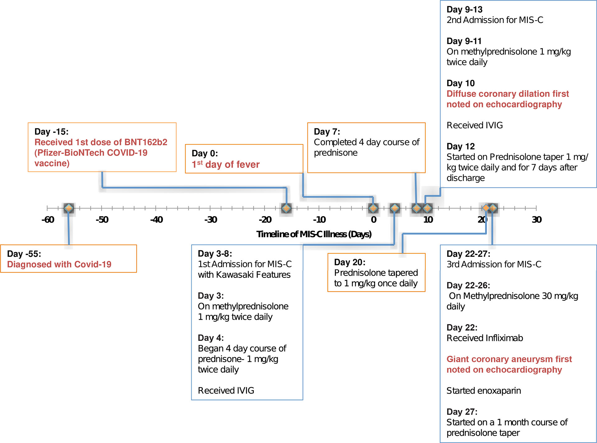 MIS-C rarely involves delayed giant coronary aneurysms, multiple readmissions, or occurrence after COVID-19 vaccination. Whether our patient’s COVID-19 vaccine 6 weeks after COVID-19 illness contributed to his MIS-C is unknown. After consultation with the CDC-funded Clinical Immunization Safety Assessment Project, the patient’s care team decided against further COVID-19 vaccination until at least three months post normalization of inflammatory markers.