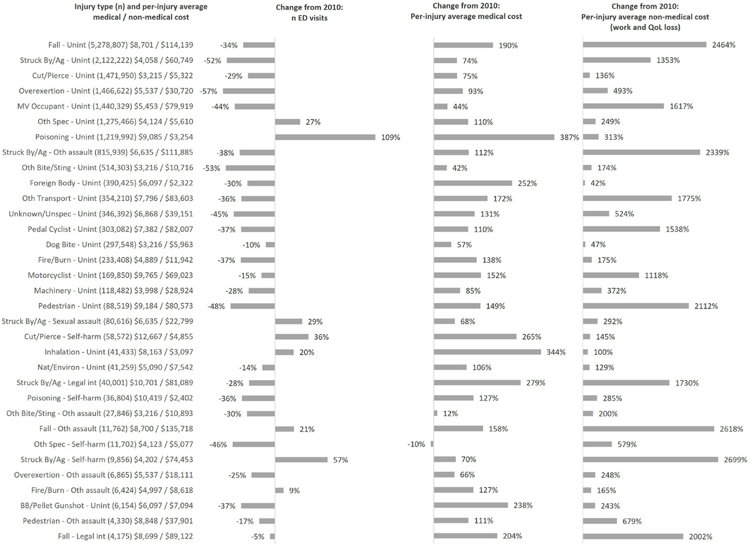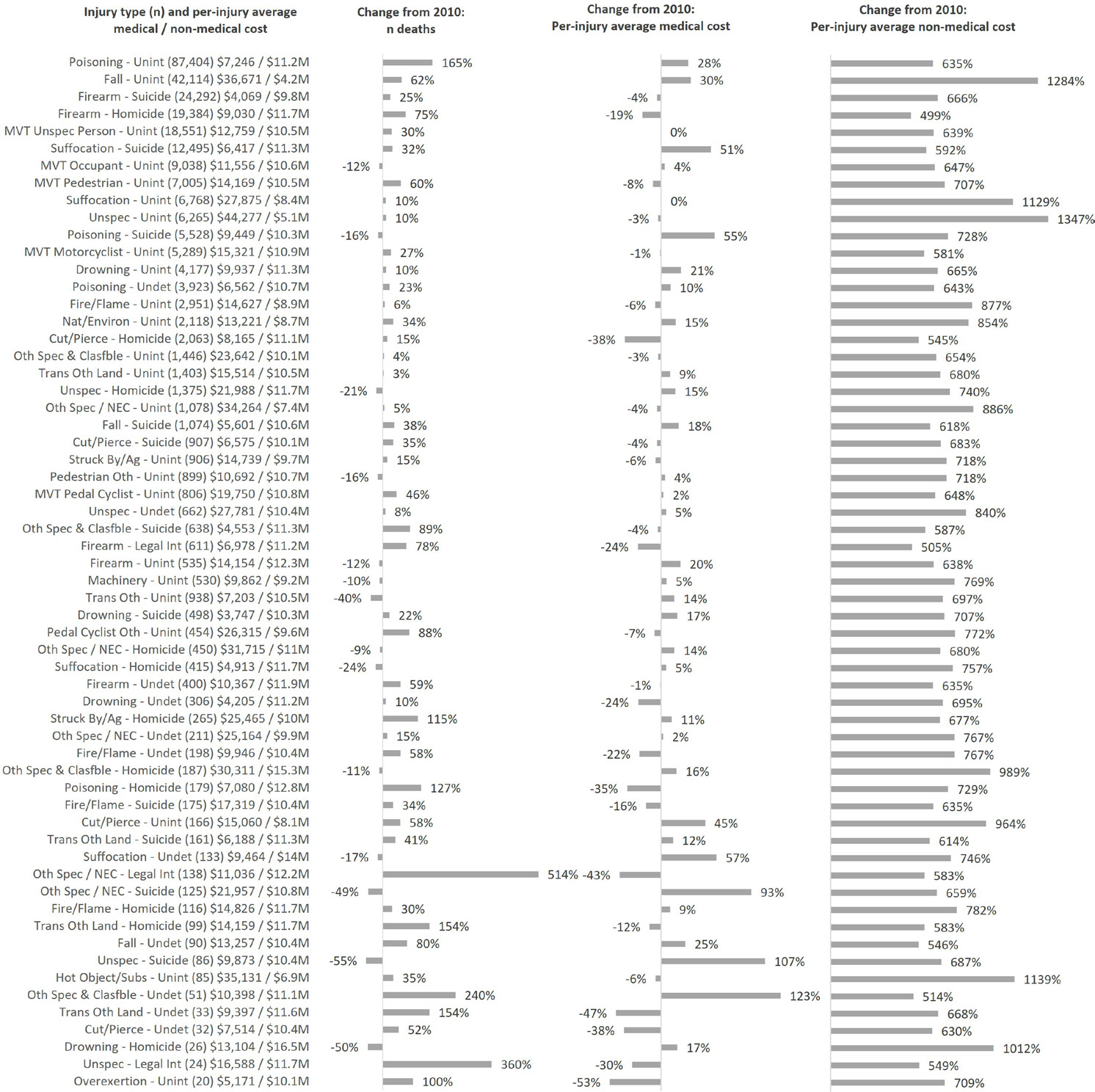 Owing to more comprehensive cost capture yielding higher per-injury average costs for most injury types—including those with high incidence in 2020 such as unintentional poisoning and unintentional falls—reported total US medical and non-medical injury costs were substantially higher in 2020 (US$4.6 trillion) compared with 2010 (US$693 billion) (both 2020 USD).