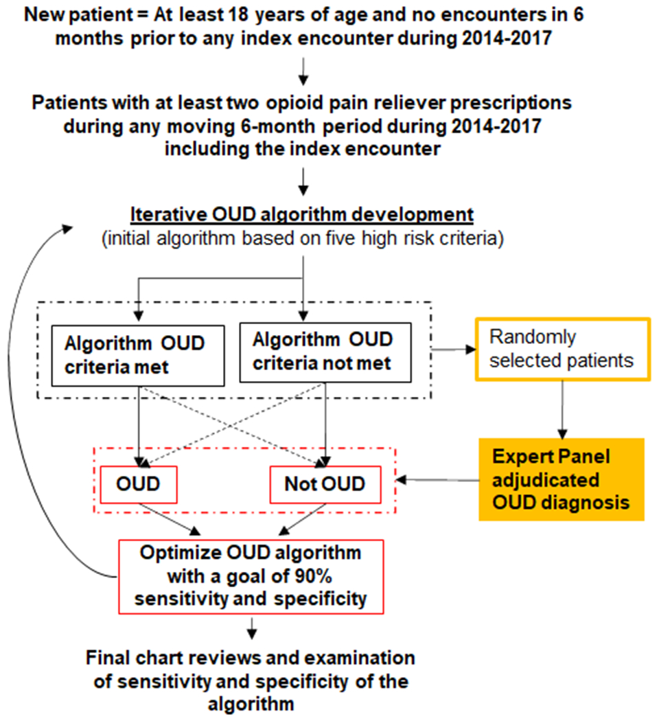 Through four iterations, we developed EHR-based OUD identification algorithms among patients who were prescribed opioids from 2014-2017. The algorithms and OUD ICD codes were validated against 169 independent “gold standard” EHR chart reviews conducted by an expert adjudication panel across four healthcare systems. After using 2014-2020 EHR for validating iteration 1, the experts were advised to use 2014-2017 EHR thereafter.