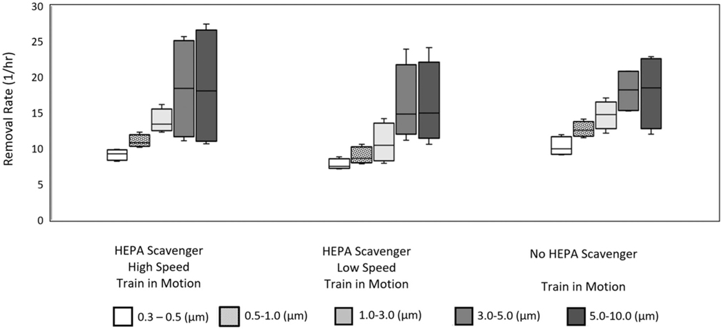 Description:A series of experiments in stationary and moving passenger railcars was conducted to measure the removal rates of particles in the size ranges of SARS-CoV-2 viral aerosols, and the air changes per hour provided by the existing and modified air handling systems. The effect of ventilation and air filtration systems on removal rates and their effects on estimated probability (i.e., risk) of infection was evaluated in a range of representative conditions: (1) for two different ratios of recirculated air (RA) to outdoor air (OA) (90:10 RA:OA and 67:33 RA:OA); (2) using minimum efficiency reporting value (MERV) filters with standard (MERV-8) and increased (MERV-13) filtration ratings; and (3) in the presence and absence of a portable high-efficiency particulate-air (HEPA) room air purifier system operated at clean air delivery rate (CADR) of 150 and 550 cfm. The higher-efficiency MERV-13 filters significantly increased particle removal rates on average by 3.8 to 8.4 hr| across particle sizes ranging from 0.3 to 10 µm (| < 0.01) compared to MERV-8 filters. The different RA:OA ratios and the use of a portable HEPA air purifier system had little effect on particle removal rates. MERV-13 filters reduced the estimated probability of infection by 42% compared to the MERV-8 filter. The use of a HEPA-air purifier with a MERV-13 filter causes a 50% reduction in the estimated probability of infection. Upgrading the efficiency of HVAC filters from MERV-8 to MERV-13 in public transit vehicles is the most effective exposure control method resulting in a clear reduction in the removal rates of aerosol particles and the estimated probability of infection.