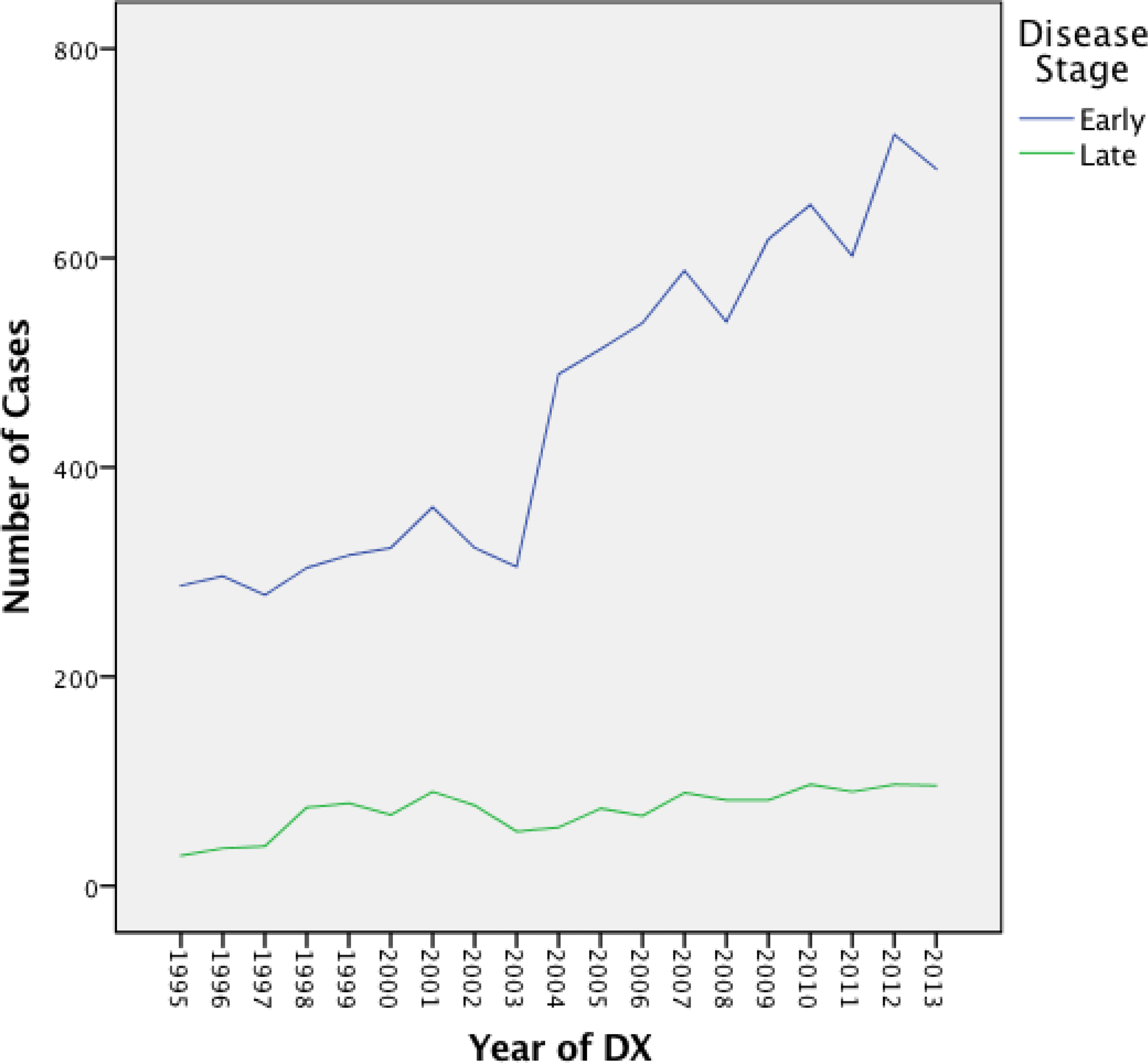 In this study population, a dramatic increase in melanoma incidence is seen from 1995 to 2013 with a three-fold increase in the number of cases per year. Of the 10,109 cases reported, 13.6% have late-stage disease with a mean age for all cases at 56.9 years and the majority male. Late-stage cases are more commonly uninsured or insured with Medicaid or Medicare compared to early-stage lesions. Having a spouse or partner is clearly protective from being diagnosed with late-stage melanoma while being uninsured or having Medicaid increases the odds of late-stage melanoma.