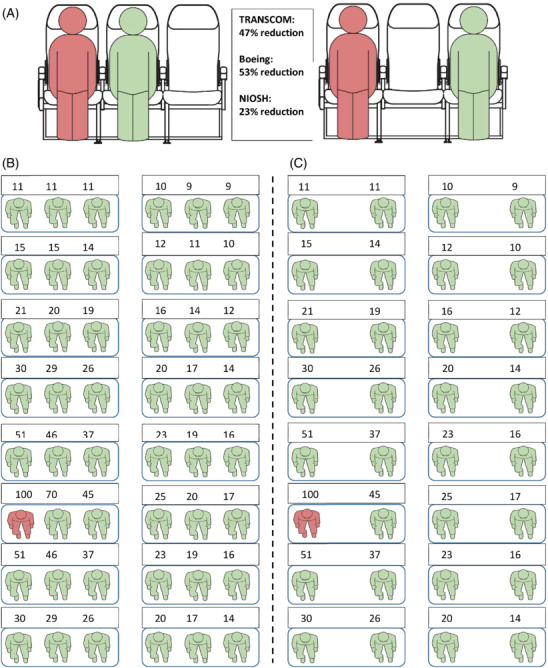 Description:Aircraft cabins have high-performance ventilation systems, yet typically hold many persons in close proximity for long durations. The current study estimated airborne virus exposure and infection reductions when middle seats are vacant compared to full occupancy and when passengers wear surgical masks in aircraft. Tracer particle data reported by U.S. Transportation Command (TRANSCOM) and CFD simulations reported by Boeing were used along with NIOSH data, to build nonlinear regression models with particle exposure and distance from particle source as variables. These models that estimate exposure at given distances from the viral source were applied to evaluate exposure reductions from vacant middle seats. Reductions averaged 54% for the seat row where an infectious passenger is located and 36% for a 24-row cabin containing one infectious passenger, with middle seats vacant. Analysis of the TRANSCOM data showed that universal masking (surgical masks) reduced exposures by 62% and showed masking and physical distancing provide further reductions when practiced together. For a notional scenario involving 10 infectious passengers, compared with no intervention, masking, distancing, and both would prevent 6.2, 3.8, and 7.6 secondary infections, respectively, using the Wells-Riley equation. These results suggest distancing alone, masking alone, and these practiced together reduce SARS CoV-2 exposure risk in increasing order of effectiveness, when an infectious passenger is present.