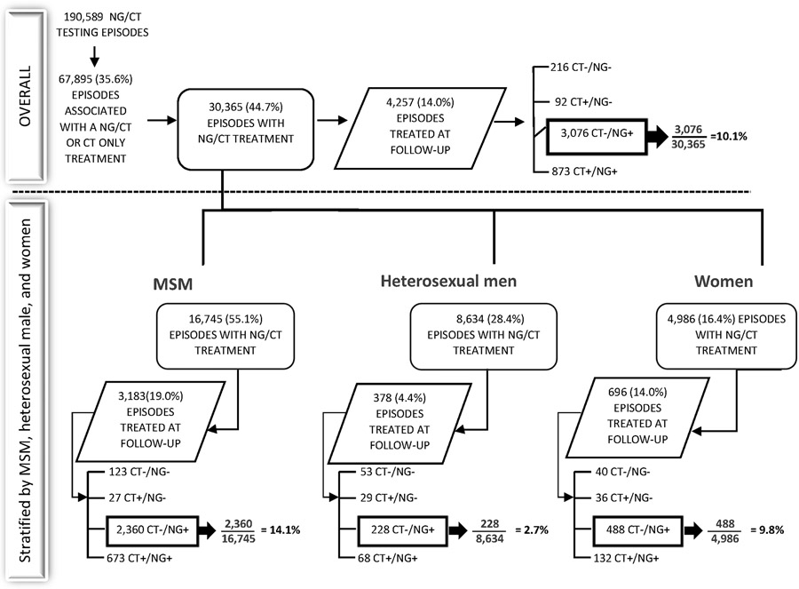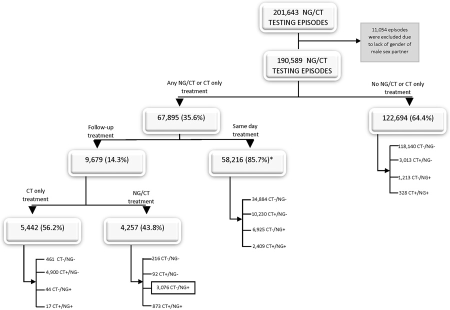 Of 190,589 episodes that occurred during the study period, 67,895 (35.6%) episodes were associated with a treatment record consistent with gonorrhea and/or chlamydia (CT only (n=37,530) or NG/CT (n=30,365)), most (~86%) were prescribed on the same-day as initial testing. Of the 67,895 episodes with corresponding treatment record(s), 42.1% were positive for either NG or CT compared to 3.7% were positive for NG or CT for those not associated with treatment records (n=122,694 episodes). Among 30,365 episodes associated with NG/CT treatment records, monotherapy would only have been indicated for 10.1% (3,081/30,365) of the episodes as they were treated on follow-up and were NG positive and CT negative.