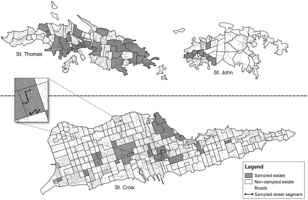 In 2016, volunteer auditors conducted the audit using a modified version of the Microscale Audit of Pedestrian Streetscapes tool. A two-stage sampling method was developed using publicly available census data to select a sample of estates (n=46) and street segments (n=1,550; 99.2 km) across the USVI. A subset of segments was audited by two independent auditors, and inter-rater reliability was assessed using Cohen’s kappa and percent agreement.