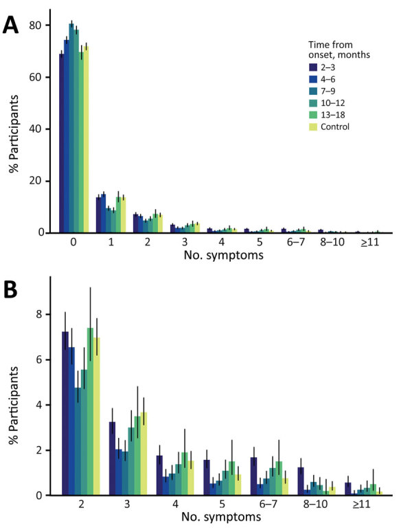 Description:We conducted a cross-sectional survey among SARS-CoV-2-positive persons and negative controls in Sapporo, Japan, to clarify symptoms of long COVID. We collected responses from 8,018 participants, 3,694 case-patients and 3,672 controls. We calculated symptom prevalence for case-patients at 2-3, 4-6, 7-9, 10-12, and 13-18 months after illness onset. We used logistic regression, adjusted for age and sex, to estimate the odds ratio (OR) for each symptom and control reference. We calculated symptom prevalence by stratifying for disease severity, age, and sex. At 4-18 months from illness onset, ORs for anosmia, ageusia, dyspnea, alopecia, and brain fog were consistently >1, whereas ORs for common cold-like, gastrointestinal, and dermatologic symptoms were <1. Time trend ORs increased for diminished ability to concentrate, brain fog, sleep disturbance, eye symptoms, and tinnitus. Clinicians should focus on systemic, respiratory, and neuropsychiatric symptoms among long COVID patients.