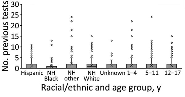 Description:To compare SARS-CoV-2 antibody seroprevalence among children with seropositive confirmed COVID-19 case counts (case ascertainment by molecular amplification) in Colorado, USA, we conducted a cross-sectional serosurvey during May-July 2021. For a convenience sample of 829 Colorado children, SARS-CoV-2 seroprevalence was 36.7%, compared with prevalence of 6.5% according to individually matched COVID-19 test results reported to public health. Compared with non-Hispanic White children, seroprevalence was higher among Hispanic, non-Hispanic Black, and non-Hispanic other race children, and case ascertainment was significantly lower among Hispanic and non-Hispanic Black children. This serosurvey accurately estimated SARS-CoV-2 prevalence among children compared with confirmed COVID-19 case counts and revealed substantial racial/ethnic disparities in infections and case ascertainment. Continued efforts to address racial and ethnic differences in disease burden and to overcome potential barriers to case ascertainment, including access to testing, may help mitigate these ongoing disparities.