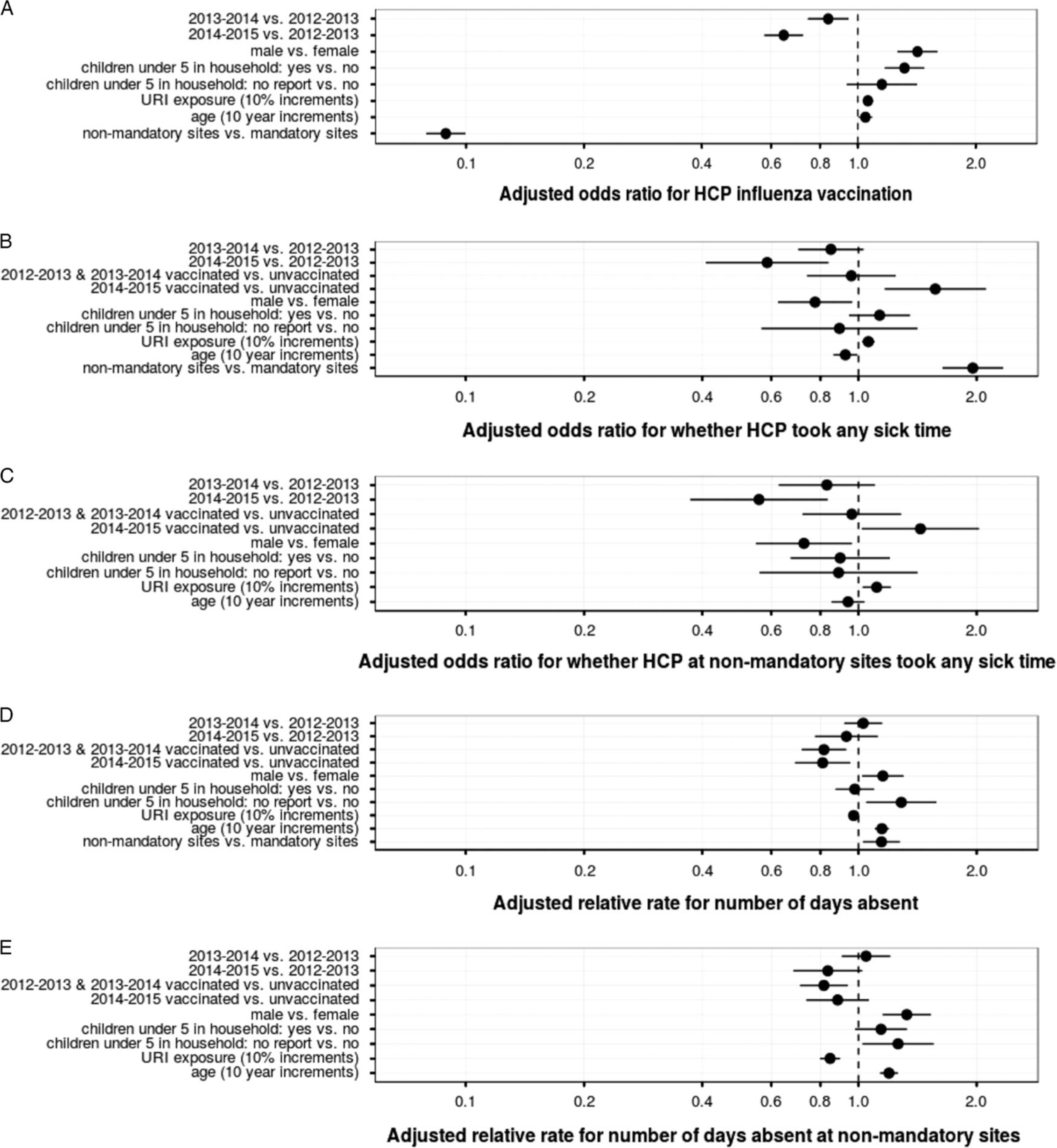 To determine the incidence and duration of absenteeism in outpatient settings, HCP participating in the Respiratory Protection Effectiveness Clinical Trial at both mandatory and nonmandatory vaccination sites over 3 viral respiratory illness (VRI) seasons (2012–2015) reported their influenza vaccination status and symptomatic days absent from work weekly throughout a 12-week period during the peak VRI season each year. The adjusted effects of vaccination and other modulating factors on absenteeism rates were estimated using multivariable regression models.