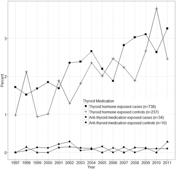 Thyroid disorders are common among reproductive-aged women, with hypothyroidism affecting 2 to 3% of pregnancies, and hyperthyroidism affecting an additional 0.1 to 1%. We examined associations between thyroid medications and individual birth defects using data from the National Birth Defects Prevention Study (NBDPS).