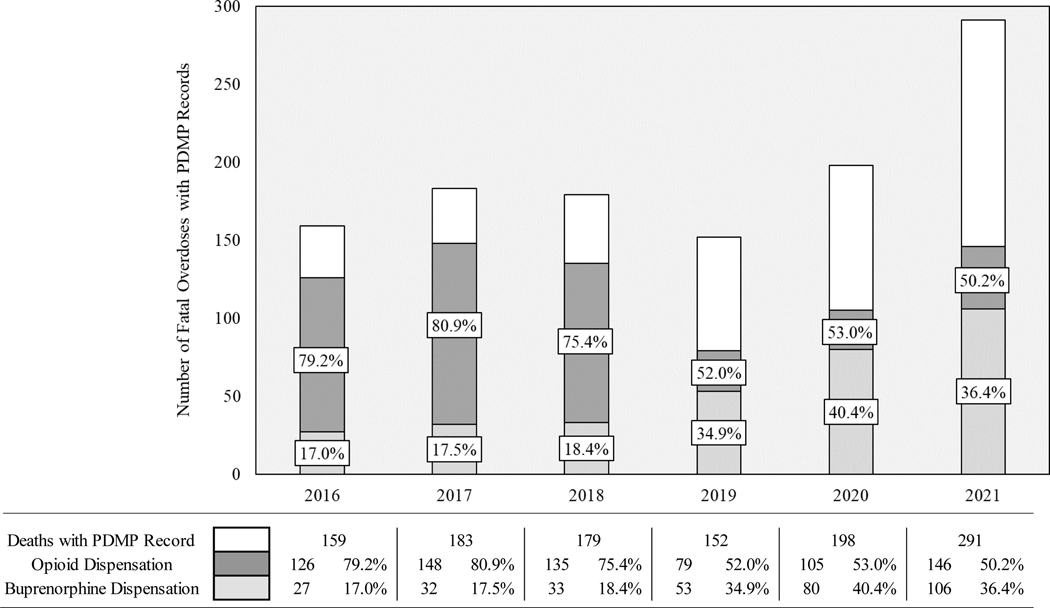We examined toxicology data from all accidental overdose deaths from 2016 to 2021 (N=2,682) in a large metropolitan area. These data were linked at the individual-level with a prescription drug monitoring program (PDMP).