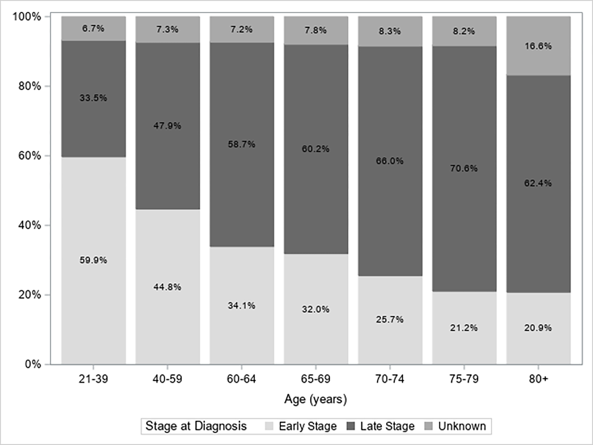 Through adequate screening and follow-up, cervical cancer can be prevented or detected at early-stage (stage I), which is related to excellent survival. Current guidelines recommend discontinuing screening for women ≥65 with history of normal Pap and/or HPV tests, potentially leaving this age group vulnerable. This study examined late-stage disease in a population-based cohort.