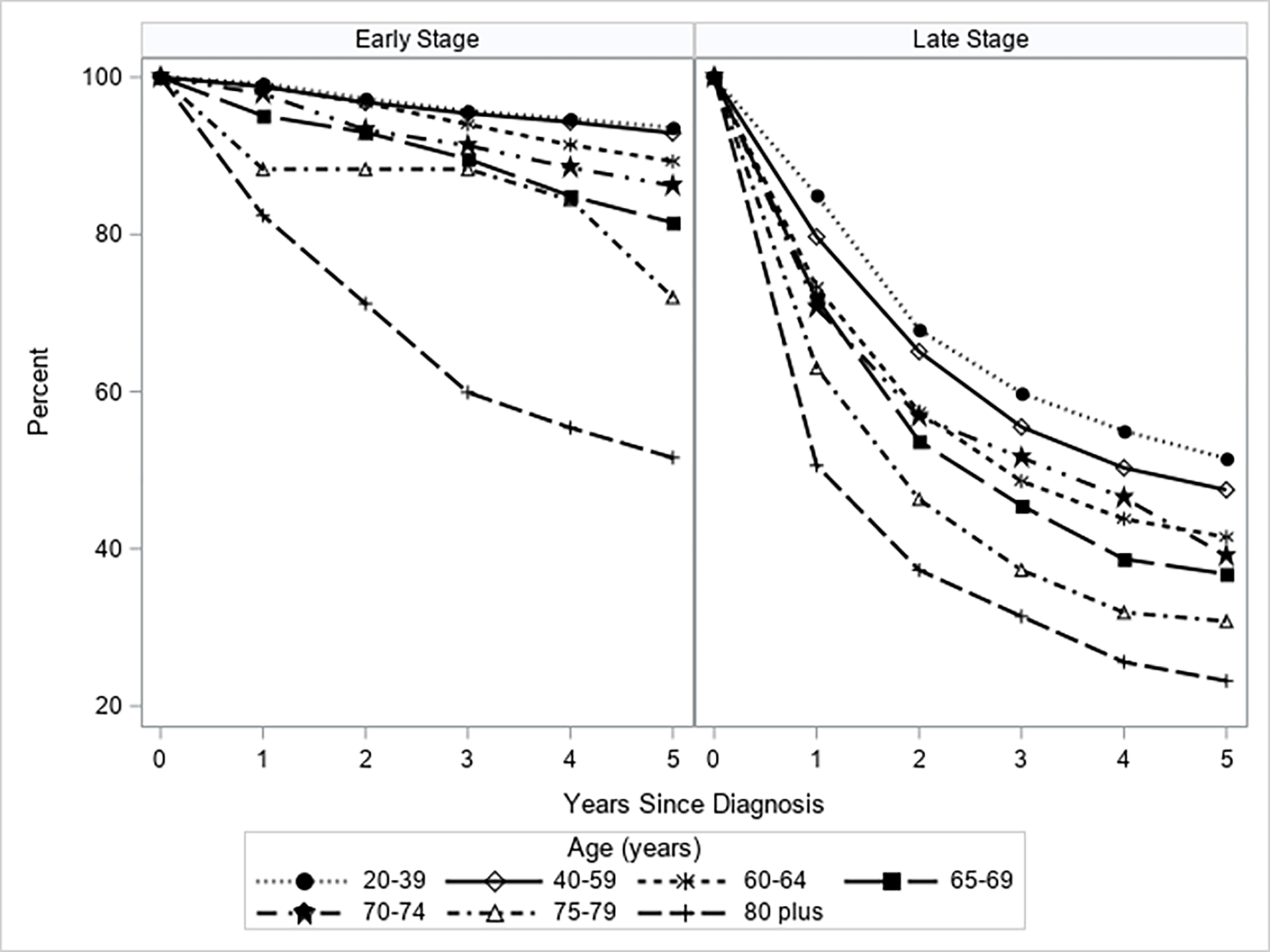 Cervical cancer stage at diagnosis and survival among women ≥65 years in California