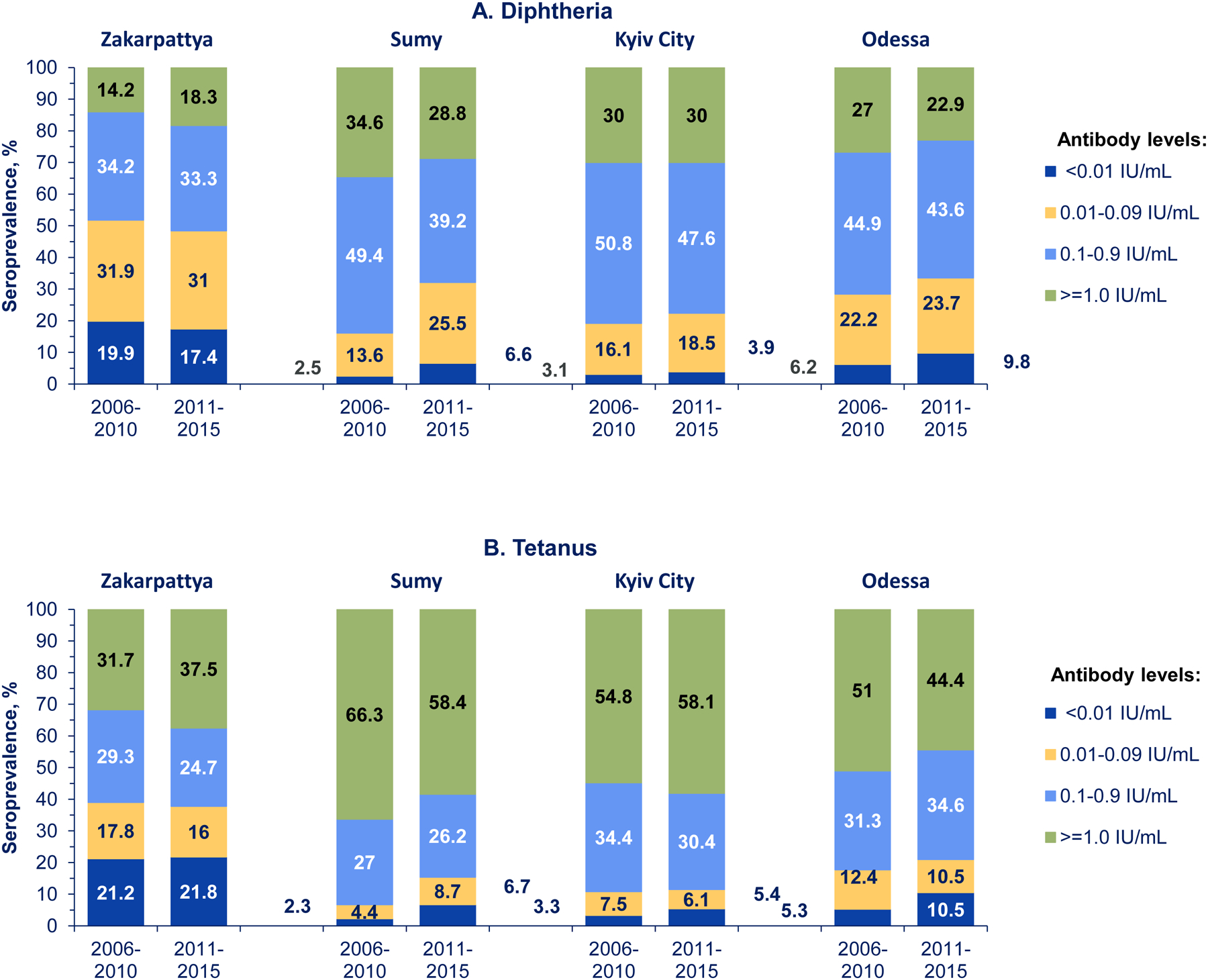 Seroprevalence of ≥0.1 IU/mL diphtheria antibodies was <80% in all survey sites (50.0%–79.2%). Seroprevalence of ≥0.1 IU/mL tetanus antibodies was ≥80% in Sumy, Kyiv City, and Odessa (80.2%–89.1%) and 61.6% in Zakarpattya. Across the sites, the proportion of children vaccinated age-appropriately with diphtheria-tetanus-containing vaccines (DTCV) was 28.5%–57.4% among children born in 2006–2010 and 34.1%–54.3% among children born in 2011–2015. The proportion of recipients of <3 DTCV doses increased from 7.1%–16.7% among children born in 2006–2010 to 19.8%–38.6% among children born in 2011–2015, as did the proportion of recipients of zero-DTCV doses (2.6%–8.8% versus 8.0%–14.0%, respectively).