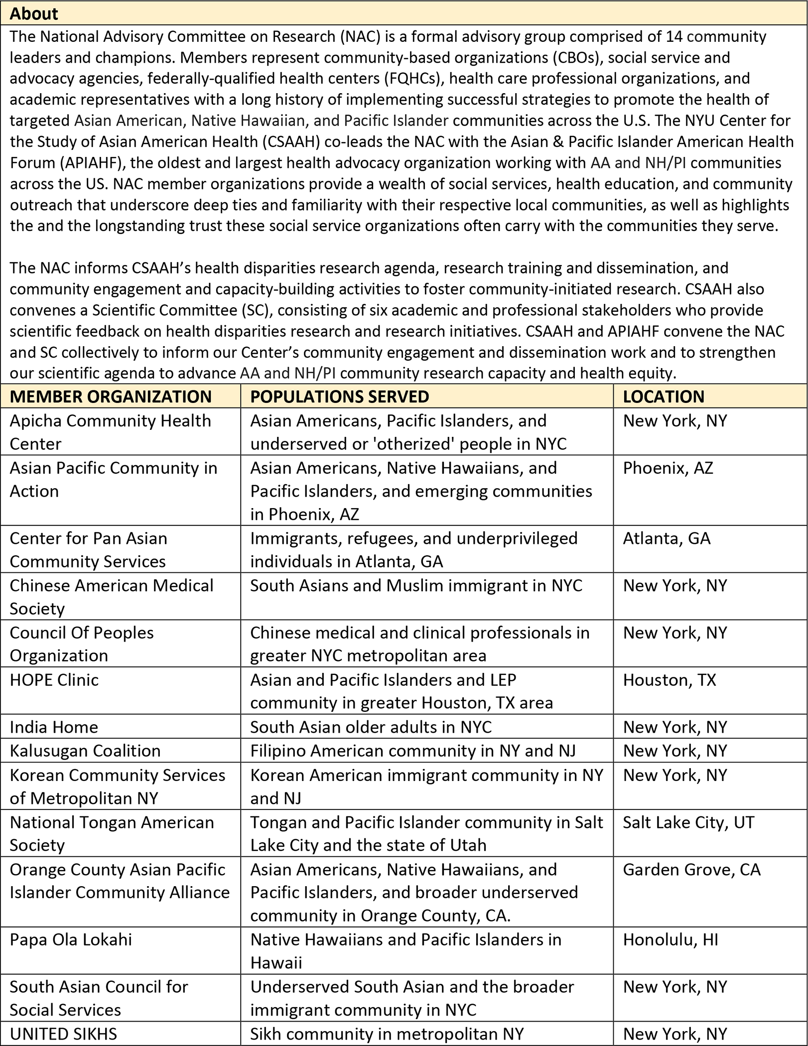 The NYU Center for the Study of Asian American Health collaboratively developed and administered a large-scale health needs assessment in diverse, low-income Asian American and Pacific Islander communities in New York City and three US regional areas using an in-person or web-based, community-engaged approach.