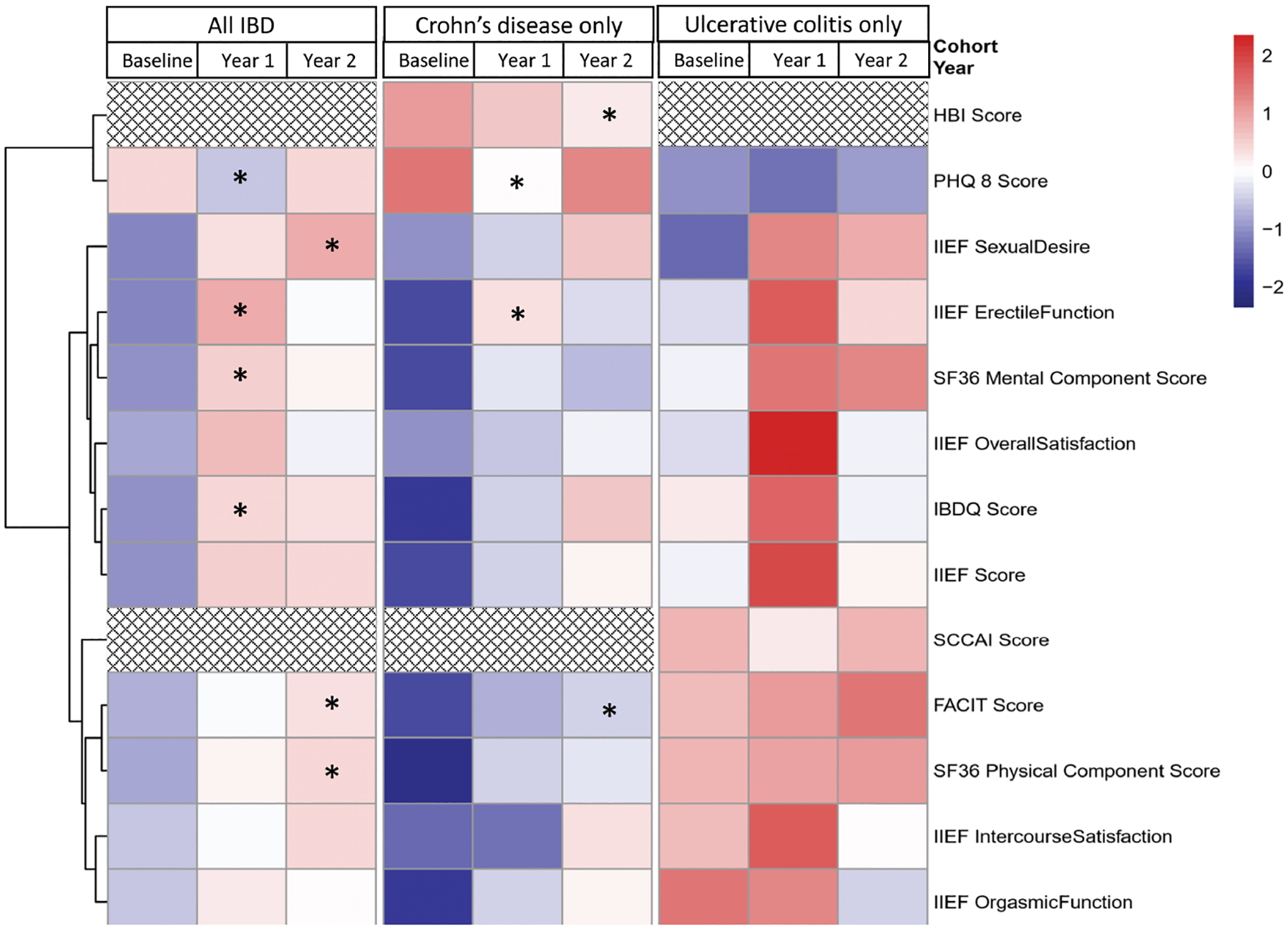 Men 18 years and older enrolled between April 2008 and January 2013 in the Ocean State Crohn’s and Colitis Area Registry (OSCCAR) with a minimum of 2 years of follow-up were eligible for study. Male sexual function was assessed using the International Index of Erectile Function (IIEF), a self-administered questionnaire that assesses 5 dimensions of sexual function over the most recent 4 weeks. To assess changes in the IIEF per various demographic and clinical factors, linear mixed effects models were used.