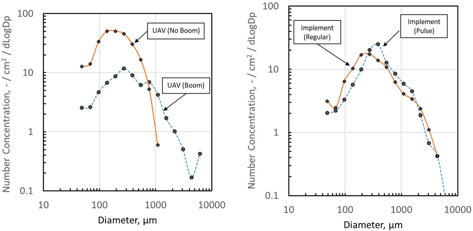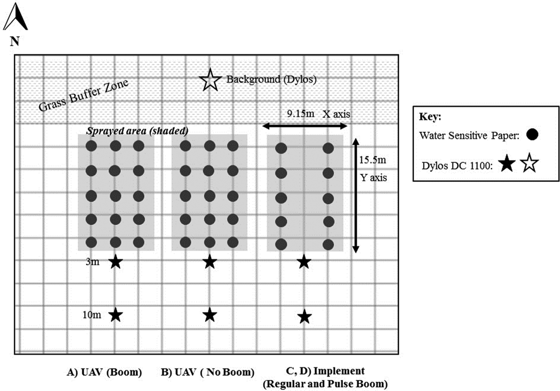 Description:Worldwide, the use of uncrewed aerial vehicles (UAVs) for pesticide application has grown tremendously in the past decade. Their adoption has been slower for Midwestern row crops. This study compared droplet size, coverage, and drift potential of sprays from UAV application methods to those from ground (implement) sprayer methods on corn in the Midwest. Droplet sizes measured during UAV spray trials [geometric mean diameters of 179 and 112 μm for UAV (boom) and UAV (no boom), respectively] were substantially smaller than those deposited during implement spray trials [mean diameters of 303 and 423 μm for implement (regular) and implement (pulse)]. Droplet coverage was high and localized in the middle swath of the field for the UAV with boom (10 to 30 droplets cm|) and with no boom (60 droplets cm|). Droplet coverage was broader, covering the entire field width for the implement methods (10 to 40 droplets cm|). Vertical coverage of droplets was more uniform for UAV methods than implement methods. Although the UAVs produced smaller droplets than the implement methods, we still observed greater potential for downwind pesticide drift during the implement spray trials. Because localized application may be beneficial for pest control and drift reduction, the findings indicate a strong potential for "spot" or "band" spray coverage using UAV methods. This is likely due to the smaller size, reduced spray volumes, and increased agility of UAVs as compared to more conventional methods.