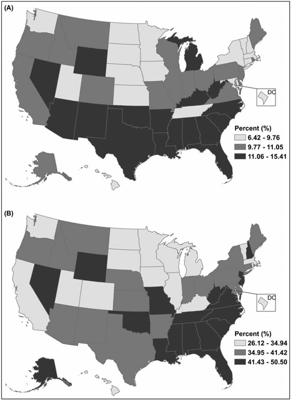 We used 2016 Behavioral Risk Factor Surveillance System data to calculate age-adjusted weighted prevalence of 5 health-risk factors by UHCN and insurance status and to assess the association of UHCN with these factors using multivariable logistic regression.