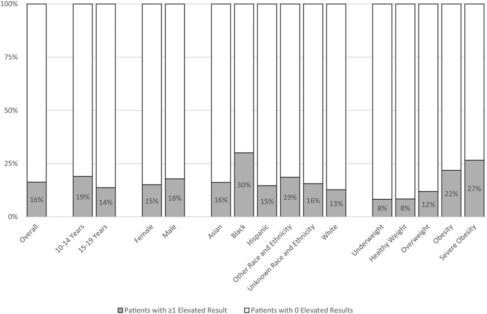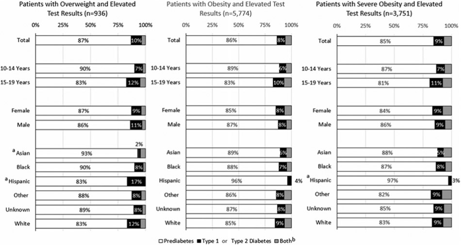 Among 1,024,743 patients, 17% had overweight, 21% had obesity, including 8% with severe obesity. Among patients with excess weight, 10% had ≥1 glucose test result. Among those tested, elevated values were more common in patients with severe obesity (27%) and obesity (22%) than in those with healthy weight (8%), and among Black youth (30%) than White youth (13%). Among patients with excess weight, >80% of elevated values fell in the prediabetes range.