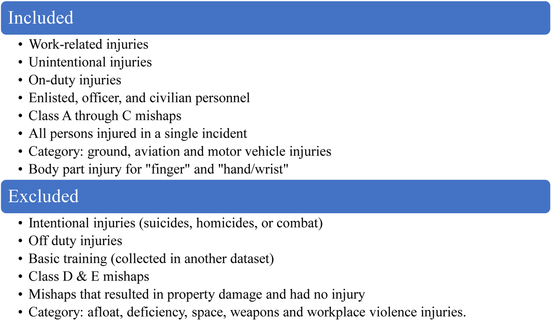 Fingers, hands, and wrists (FHW) are the most frequently injured body parts in work-related injuries. This study described and compared FHW injuries among enlisted, officer, and civilian U.S. Air Force (USAF) personnel to those in the U.S. workforce.