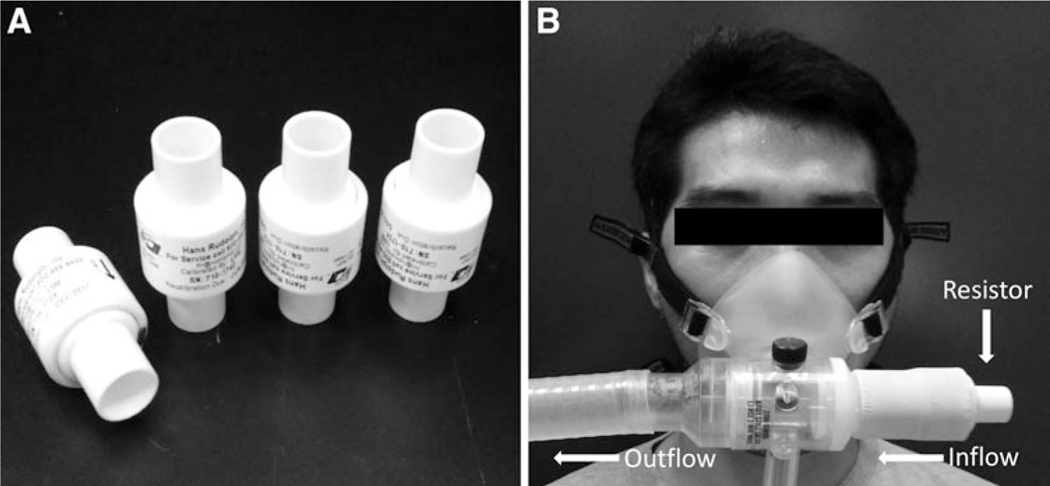 Nine healthy men wore a tight-fitting respiratory mask outfitted with one of four different inspiratory resistors (R) (0, 1.5, 4.5, 7.5 cm H2O/L/Sec) while exercising at normobaric hypoxia (17% O2) at submaximal exercise workloads of 50, 100, and 150 W on a cycle ergometer for 10 minutes each, followed by a maximal oxygen uptake (VO2max) test to exhaustion.