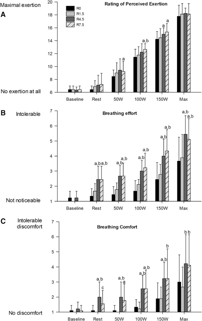Maximal power output at R7.5 was significantly lower than R0 (p = 0.016) and R1.5 (p = 0.035). Respiration rate was significantly reduced at R4.5 (p = 0.011) and R7.5 (p ≤ 0.001) compared with R0. Minute ventilation was significantly decreased in R7.5 compared with R0 (p = 0.003), R1.5 (p = 0.010), and R4.5 (p = 0.016), whereas VO2 was not significantly changed. Breathing comfort (BC) and breathing effort (BE) were significantly impaired in R7.5 (BC: p = 0.025, BE: p = 0.001) and R4.5 (BC: p = 0.007, BE: p = 0.001) compared with R0, but rating of perceived exertion (RPE) remained unchanged.