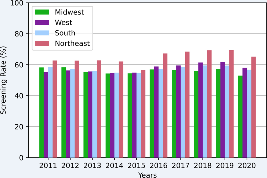 We analyzed the chlamydia screening rates among sexually active women aged 16–24 from 2011–2020 using the chlamydia measures in the Healthcare Effectiveness Data and Information Set (HEDIS) dataset. The annual national chlamydia screening rates was further stratified by census region and by patient age.