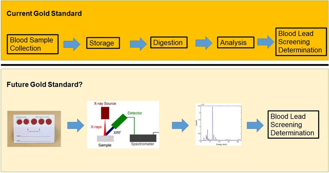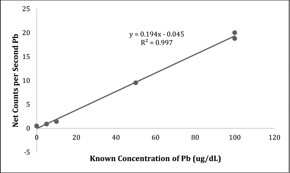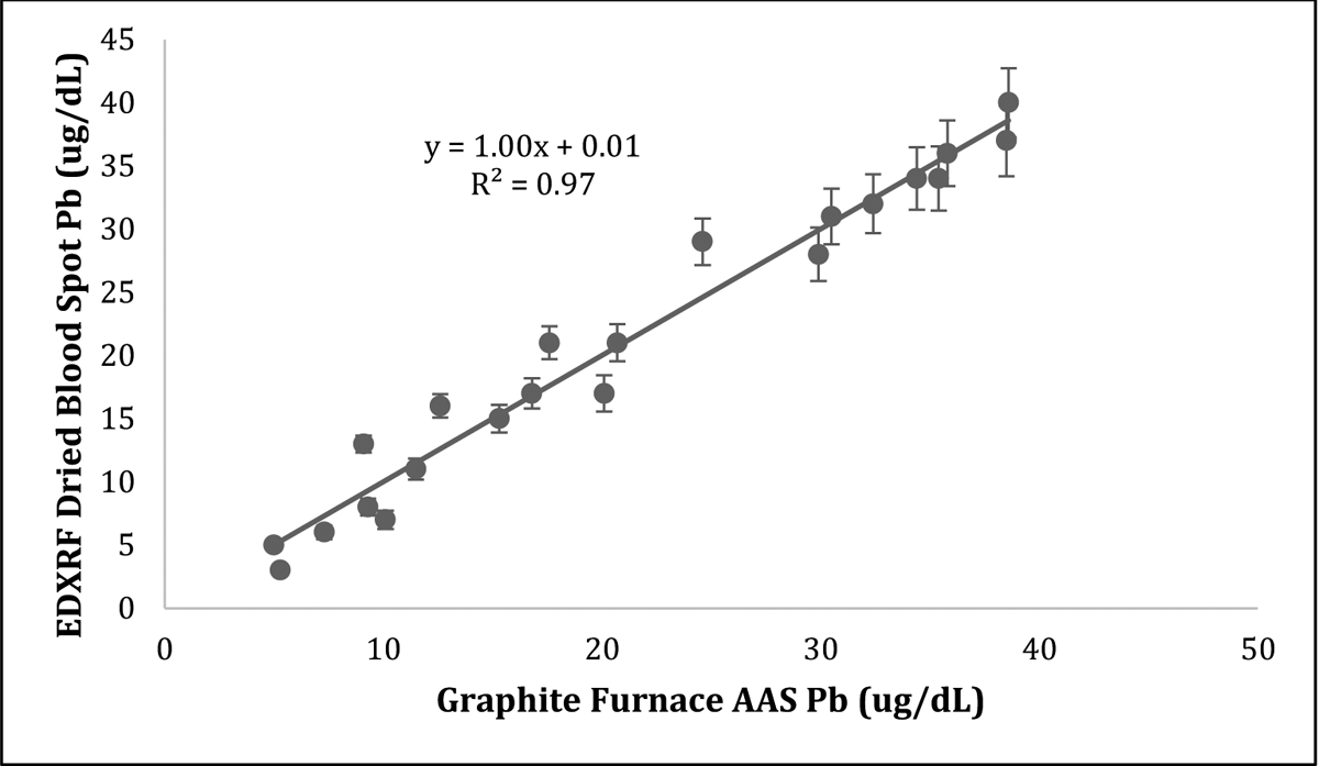 Description:Collecting blood spots from newborns is a common procedure used to diagnose multiple health conditions. Fingerstick blood samples are routinely collected from children to diagnose elevated blood lead levels. In our study, we wanted to test the feasibility of using a high-power energy-dispersive X-ray fluorescence (EDXRF) device to accurately measure the concentration of lead in blood spots. We created spotted standards of a known concentration of lead on a filter paper at different volumes and concentrations. We determined the detection limit for lead through repeated measurements of our standards and calibration line slopes. We also tested the variability of the measured lead concentration across procedures and spotted blood volumes and found no significant additions to uncertainty in measurements. Finally, we compared blood lead concentrations measured by EDXRF and atomic absorption spectroscopy (AAS) and found EDXRF to be a significant predictor of blood lead (| = 22, R = 0.98, | value <0.001) with an average detection limit of 1.7 μg/dL of blood lead. This detection limit is similar to that of the AAS technique, which is commonly used in clinical testing laboratories for blood lead surveillance. These findings provide a proof of concept that blood spots measured by EDXRF may be used as a surveillance tool for lead exposure, even at elevated blood lead levels of 2-3 μg/dL.