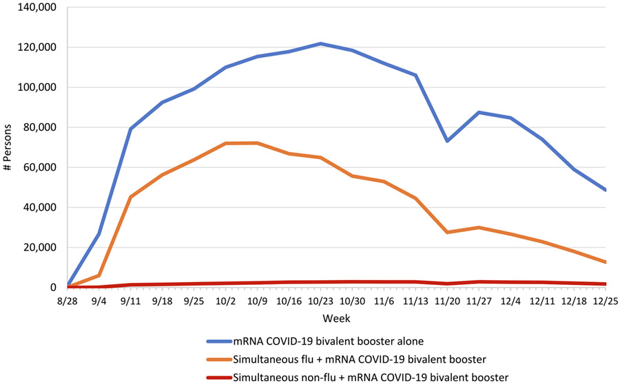 Description:The U.S. Food and Drug Administration authorized use of mRNA COVID-19 bivalent booster vaccines on August 31, 2022. Currently, CDC's clinical guidance states that COVID-19 and other vaccines may be administered simultaneously. At time of authorization and recommendations, limited data existed describing simultaneous administration of COVID-19 bivalent booster and other vaccines. We describe simultaneous influenza and mRNA COVID-19 bivalent booster vaccine administration between August 31-December 31, 2022, among persons aged ≥6 months in the Vaccine Safety Datalink (VSD) by COVID-19 bivalent booster vaccine type, influenza vaccine type, age group, sex, and race and ethnicity. Of 2,301,876 persons who received a COVID-19 bivalent booster vaccine, 737,992 (32.1%) received simultaneous influenza vaccine, majority were female (53.1%), aged ≥18 years (91.4%), and non-Hispanic White (55.7%). These findings can inform future VSD studies on simultaneous influenza and COVID-19 bivalent booster vaccine safety and coverage, which may have implications for immunization service delivery.