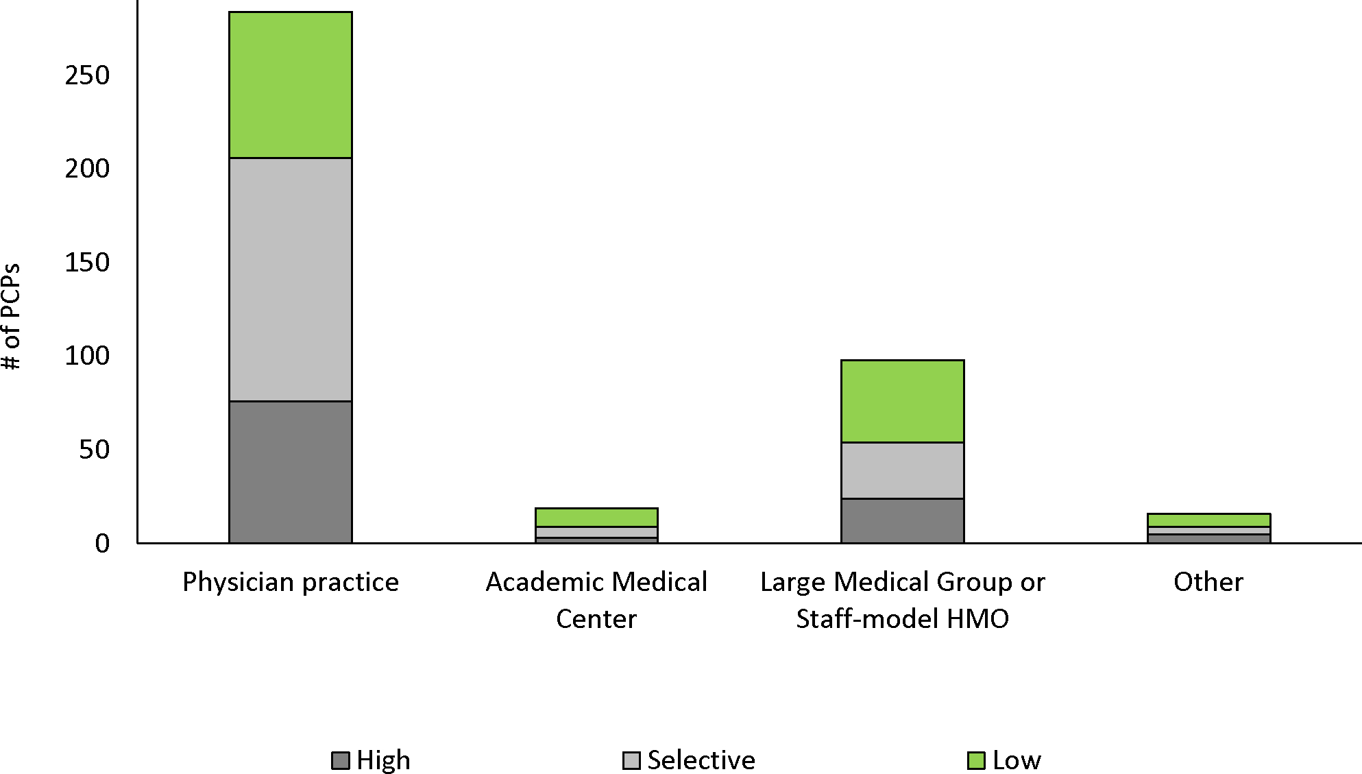A stratified random sample of PCPs identified by early-stage breast cancer survivors were surveyed (N=518, 61% response rate). PCPs were asked how likely they would be to order bone scans, imaging and/or tumor marker testing using a clinical vignette of an early-stage asymptomatic patient where these tests are non-recommended. A composite tendency to order score was created and categorized by tertiles (low, moderate, high). PCP-reported factors associated with high and moderate tendency to order non-recommended testing (vs. low) were estimated using multivariable, multinomial logistic regression.