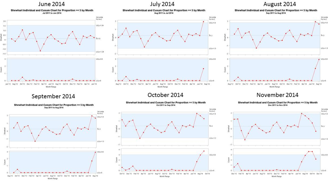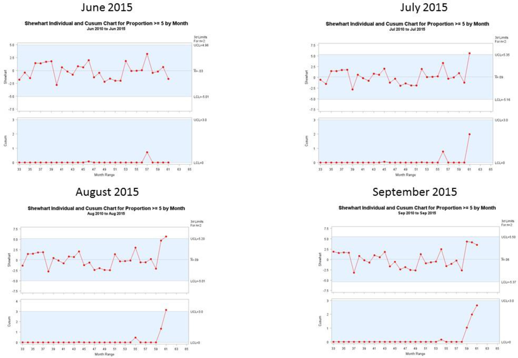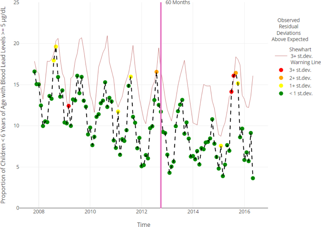The modified cumulative summary/Shewhart algorithm provides a framework for enhanced blood lead surveillance by identifying changes in the proportion of children with BLLs >=5 µg/dl. The algorithm has the potential to alert public health officials to changes requiring further important public health investigation.
