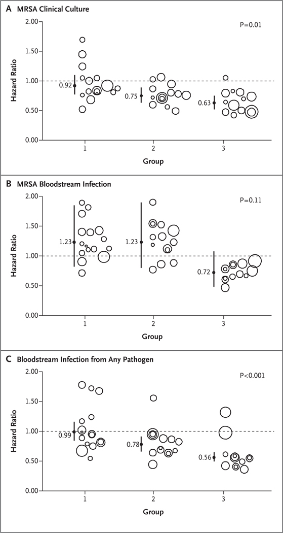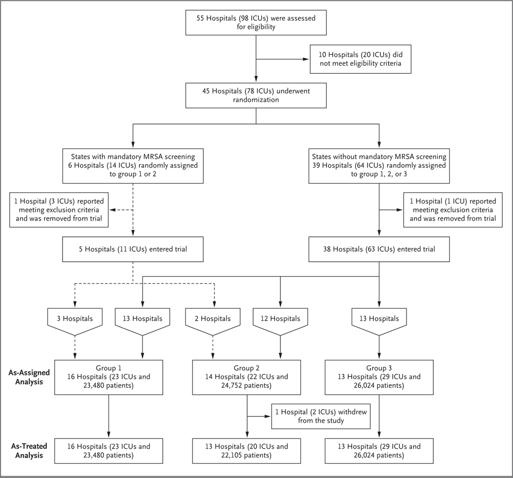 We conducted a pragmatic, cluster-randomized trial. Hospitals were randomly assigned to one of three strategies, with all adult ICUs in a given hospital assigned to the same strategy. Group 1 implemented MRSA screening and isolation; group 2, targeted decolonization (i.e., screening, isolation, and decolonization of MRSA carriers); and group 3, universal decolonization (i.e., no screening, and decolonization of all patients). Proportional-hazards models were used to assess differences in infection reductions across the study groups, with clustering according to hospital.
