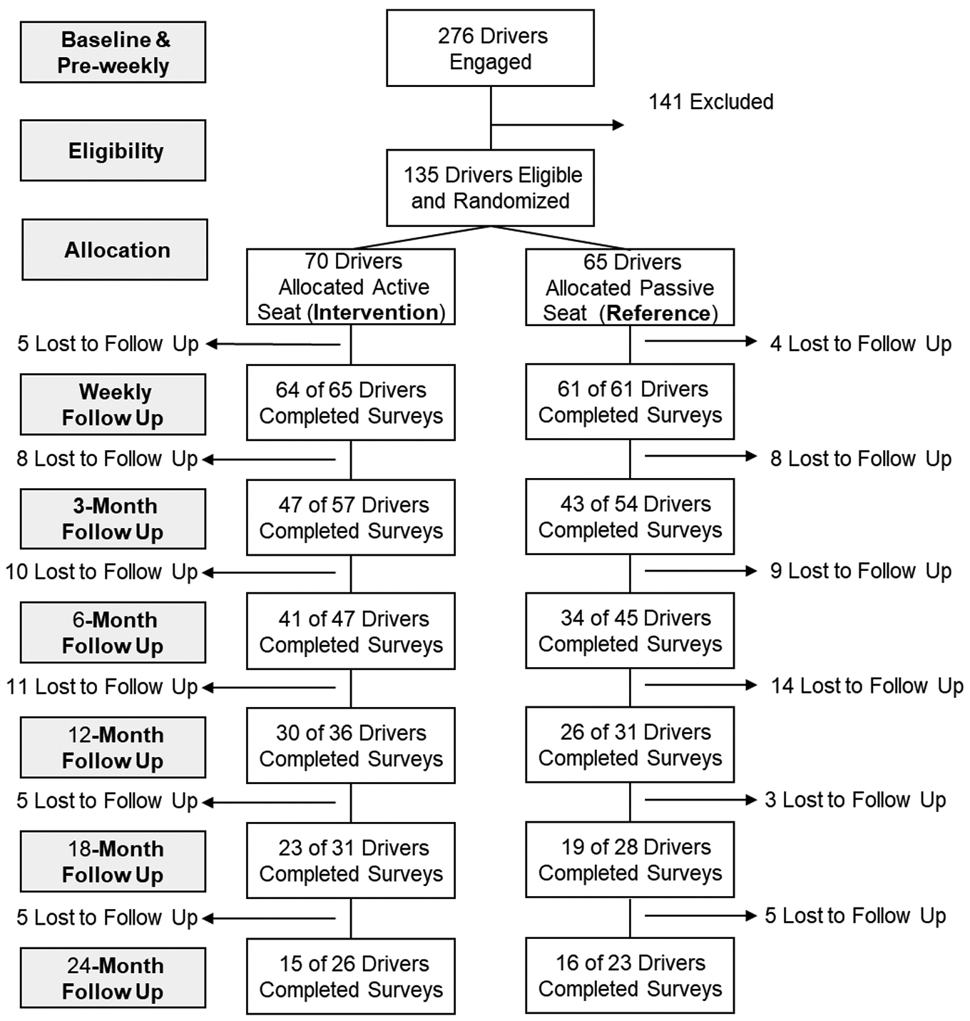 Description:Through a randomized controlled trial, we evaluated the effects of an electro-magnetic active seat suspension that reduces exposure of a long-haul truck driver to whole body vibration (WBV) on low back pain (LBP) and disability. Among 276 drivers recruited from six trucking terminals of a major US trucking company, 135 eligible drivers were assigned to either having an Active Seat (Intervention: n = 70) - the BoseRide® electro-magnetic active seat - or Passive Seat (reference: n = 65) - a new version of their current seat (passive air suspension seat) - installed in their truck via block (terminal) randomization. Low back pain (LBP) severity, on a 0-10 scale and the Oswestry LBP Disability Index were collected before and 3-, 6-, 12-, 18-, and 24-months post seat installation. LBP severity and LBP disability scores were significantly lower post seat installation in both groups. At 3 months, LBP severity decreased -1.4 [95% CI: -2.1 to -0.7: n = 46] for drivers in the Active Seat arm, and -1.5 [95% CI: -2.3 to -0.8: n = 41] for drivers in the Passive Seat arm. In a subset of drivers, WBV exposures were collected before and after the seat installation. WBV exposures significantly decreased post seat installation for Active Seat (p < 0.01) but not for Passive Seat (p = 0.15). While the new seat-suspension technology reduced WBV exposures, LBP appeared to be improved by multiple factors. These results were limited by the secondary prevention approach and the longer-term loss to follow up due to large rates of driver turnover typical for the industry.