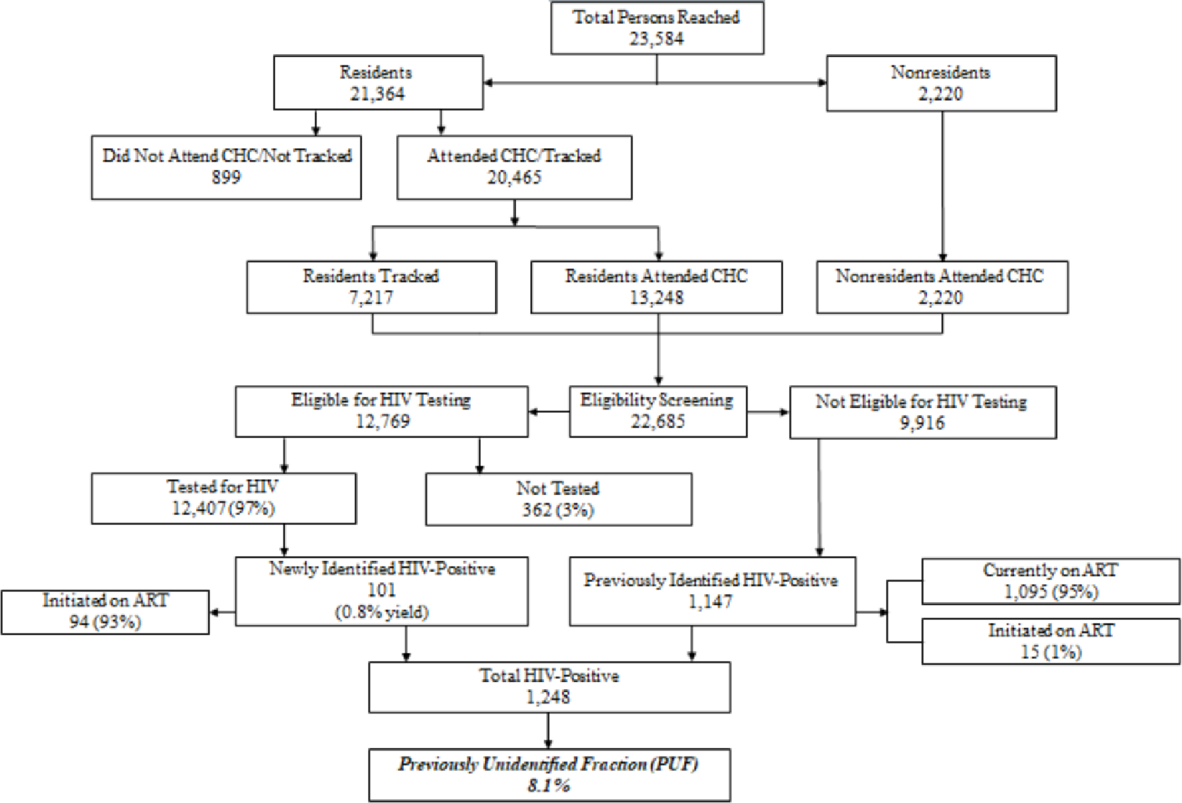 CHI reached a total of 23,584 persons. Of 12,768 HTS-eligible individuals, 12,407 (97%) accepted testing, including 3,917 (32%) first-time testers. There were 101 newly identified PLWH out of 1,248 total HIV-positive persons, representing an 8·1% PUF. The PUF was higher among men (9·8%) and youth ages 15–24 (15·3%). Ninety-four newly identified persons (93%) initiated same-day treatment.