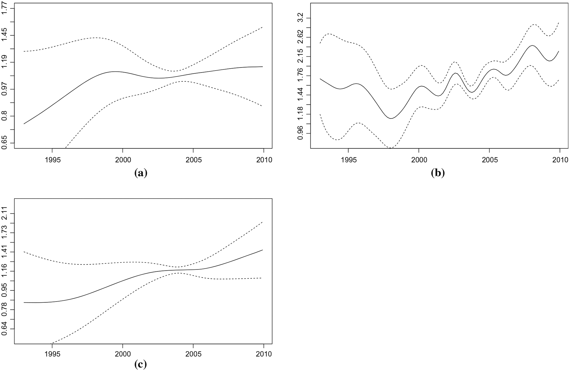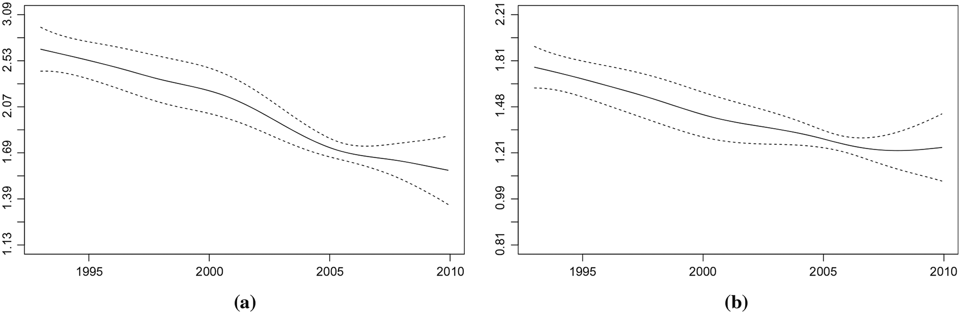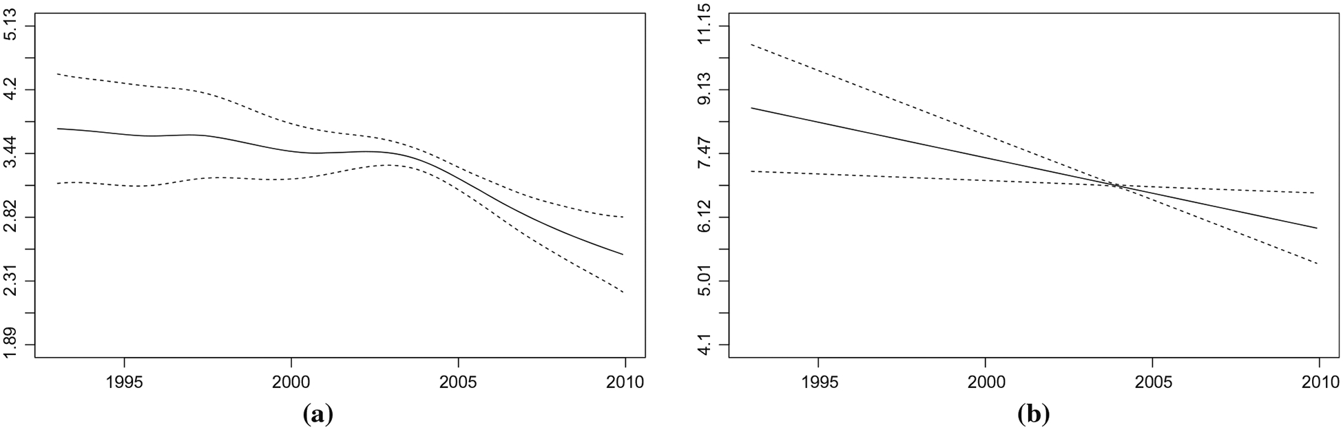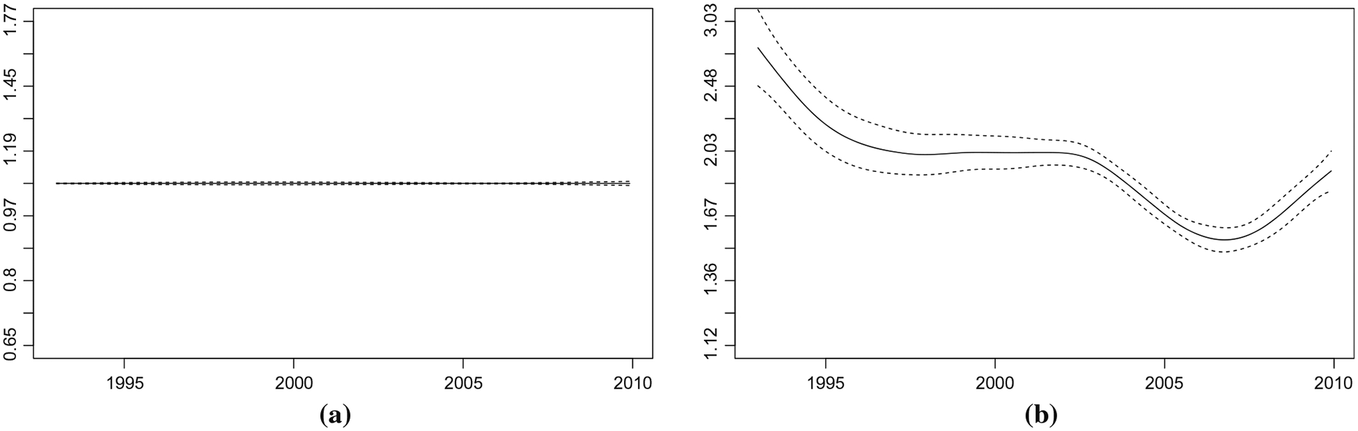 To explore the changing disparities in access to health care insurance in the United States using time-varying coefficient models.