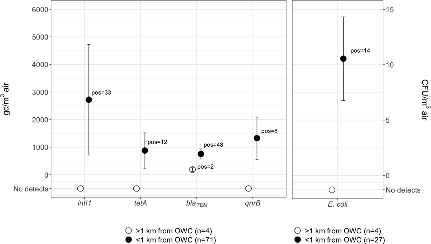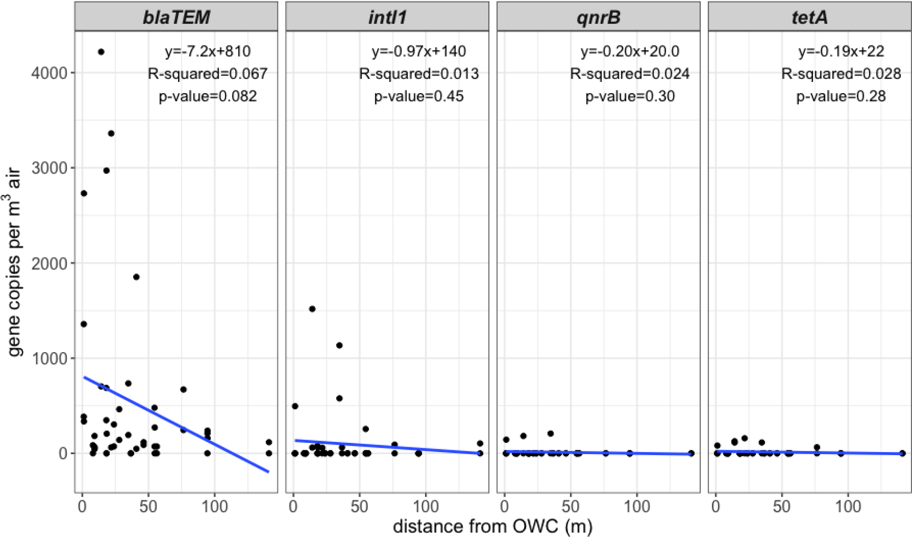 Description:Antibiotic resistance poses a major global health threat. Understanding emergence and dissemination of antibiotic resistance in environmental media is critical to the design of control strategies. Because antibiotic resistance genes (ARGs) may be aerosolized from contaminated point sources and disseminated more widely in localized environments, we assessed ARGs in aerosols in urban La Paz, Bolivia, where wastewater flows in engineered surface water channels through the densely populated urban core. We quantified key ARGs and a mobile integron (MI) via ddPCR and E. coli spp. as a fecal indicator by culture over two years during both the rainy and dry seasons in sites near wastewater flows. ARG targets represented major antibiotic groups-tetracyclines (tetA), fluoroquinolines (qnrB), and beta-lactams (bla|)-and an MI (intI1) represented the potential for mobility of genetic material. Most air samples (82%) had detectable targets above the experimentally determined LOD: most commonly bla| and intI1 (68% and 47% respectively) followed by tetA and qnrB (17% and 11% respectively). ARG and MI densities in positive air samples ranged from 1.3 × 10| to 6.6 × 10| gene copies/m| air. Additionally, we detected culturable E. coli in the air (52% of samples <1 km from impacted surface waters) with an average density of 11 CFU/m| in positive samples. We observed decreasing density of bla| with increasing distance up to 150 m from impacted surface waters. To our knowledge this is the first study conducting absolute quantification and a spatial analysis of ARGs and MIs in ambient urban air of a city with contaminated surface waters. Environments in close proximity to urban wastewater flows in this setting may experience locally elevated concentrations of ARGs, a possible concern for the emergence and dissemination of antimicrobial resistance in cities with poor sanitation.