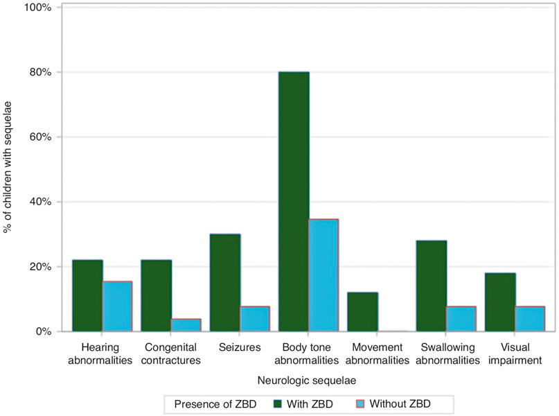 Among 2248 infants, 10.1% were born preterm, and 10.5% were small-for-gestational age. Overall, 122 (5.4%) had any ZBD; 91.8% of infants had brain abnormalities or microcephaly, 23.0% had eye abnormalities, and 14.8% had both. Of 1881 children ≥1 follow-up exam reported, neurologic sequelae were more common among children with ZBD (44.6%) vs. without ZBD (1.5%). Of children with ≥1 visit with development reported, 46.8% (51/109) of children with ZBD and 7.4% (129/1739) of children without ZBD had confirmed or possible developmental delay.