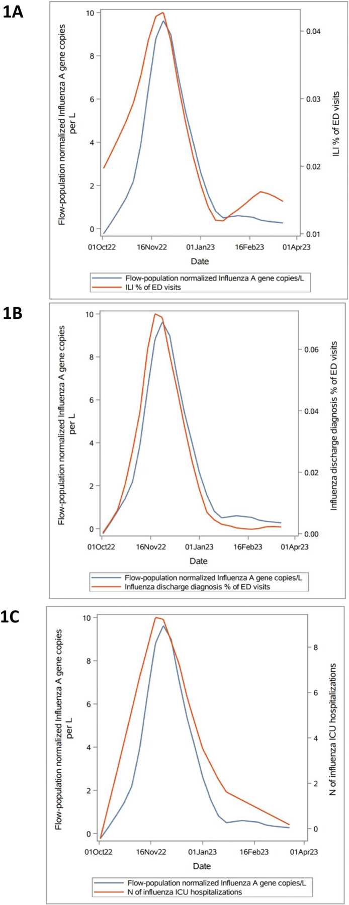 Description:Influenza is a respiratory illness that can result in serious outcomes, particularly among persons who are immunocompromised, aged <5 years or aged >65 years. Traditional influenza surveillance approaches rely upon syndromic surveillance of emergency departments and public health reporting from clinicians and laboratories. Wastewater surveillance infrastructure developed to monitor SARS-CoV-2 is being used for influenza surveillance in the Chicago area. The goal was to evaluate timeliness and correlations between influenza virus detected through wastewater surveillance and traditional influenza surveillance measures to assess utility of wastewater surveillance for influenza at the county level. Specifically, we measured correlations between influenza virus gene copies in wastewater samples and 1) the number of intensive care unit admissions associated with a diagnosis of influenza, 2) the percentage emergency department (ED) visits for influenza-like-illness, and 3) the percentage of ED visits with influenza diagnosis at discharge| in Cook County. Influenza concentrations in wastewater were strongly correlated with traditional influenza surveillance measures, particularly for catchment areas serving >100,000 residents. Wastewater indicators lagged traditional influenza surveillance measures by approximately one week when analyzed in cross-correlations. Although wastewater data lagged traditional influenza surveillance measures in this analysis, it can serve as a useful surveillance tool as a complement to syndromic surveillance; it is a form of influenza surveillance that does not rely on healthcare-seeking behavior or reporting by healthcare providers.