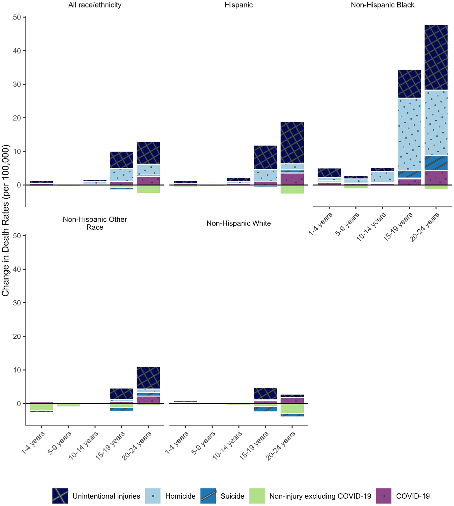 Age-adjusted death rates in young persons 1–24 years of age increased by 14.3% during the pandemic. Injury-related causes accounted for 78.2% of the increase, driven mainly by increases in homicides and unintentional injuries related to drug overdose, firearms, and motor-vehicle traffic crashes. Non-Hispanic Black and Hispanic teens and young adults experienced the largest increases in deaths overall and across the leading causes of death.